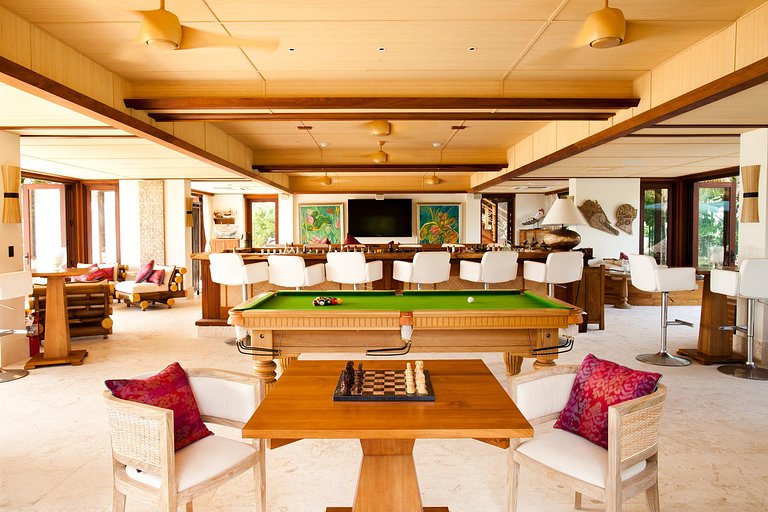 Empoleirado em Devil's Hill e com incríveis vistas panorâmicas. Também conhecido como o coração da ilha, a Great House é brilhante e arejada e tem um terraço ao ar livre com redes e sofás. Há também um bar totalmente abastecido, onde nossa equipe pode fazer seus cocktails favoritos, ou você pode se servir! Há muitos sofás e almofadas confortáveis, um sistema de entretenimento, uma piscina infinita e no ponto mais alto você encontrará uma banheira de hidromassagem para dois. O terraço do terraço é ideal para jantar até 40 pessoas, com pratos preparados pelos nossos chefs na cozinha topo de gama. Há também uma tirolesa para Turtle Beach, para aqueles viciados em adrenalina!