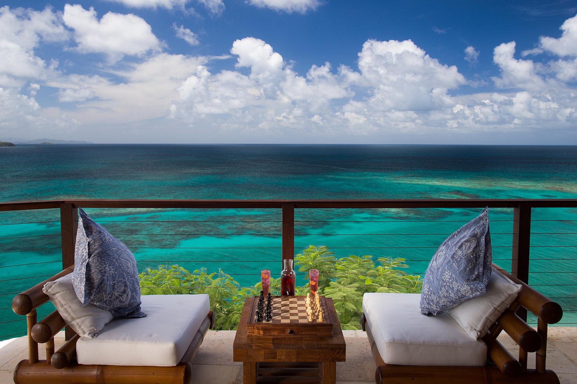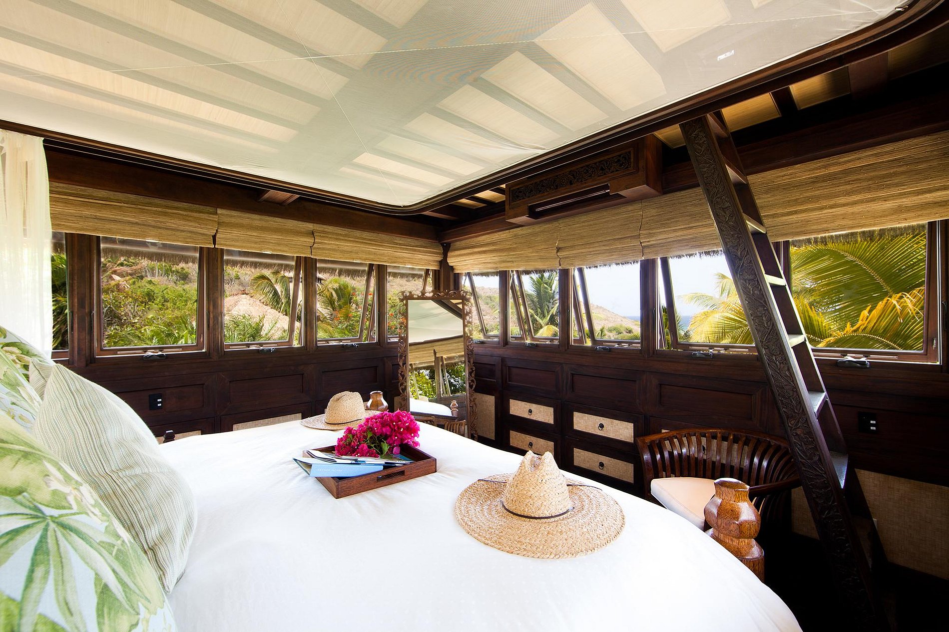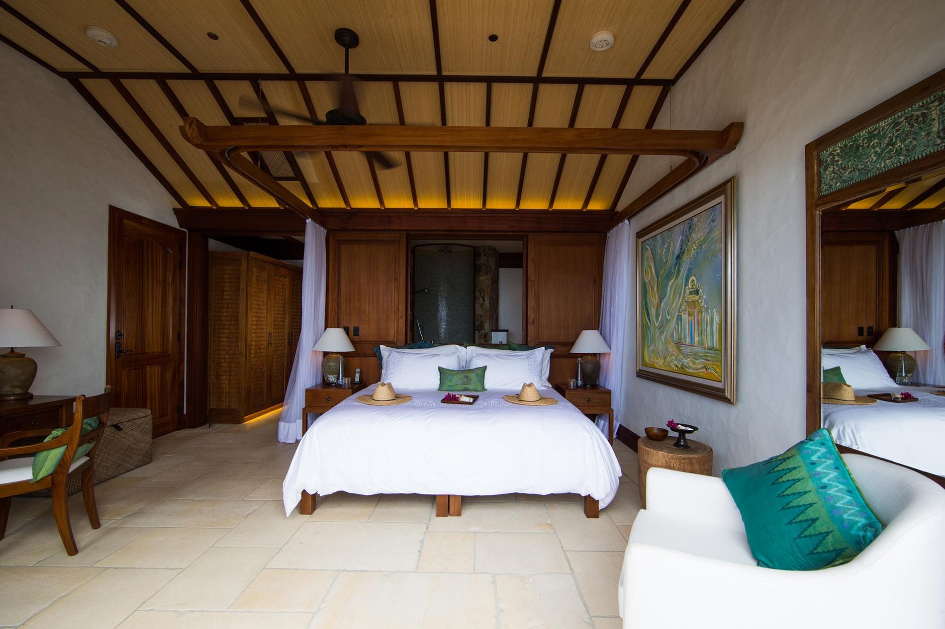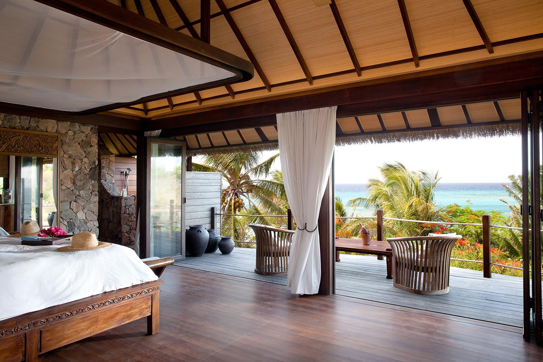 Misturando-se na paisagem tropical são oito belas casas balinesas que oferecem aos hóspedes vistas deslumbrantes sobre o oceano e privacidade. Mesmo no centro da ilha, Temple House, uma suite com piscina infinita, salão e cozinha separados e o Love Temple privado, cada um dormindo dois adultos. Acomodação adicional está disponível em The Great House, uma espaçosa villa balinesa com estilo ao ar livre, que possui incríveis vistas panorâmicas sobre o Caribe, o Atlântico e as ilhas vizinhas.