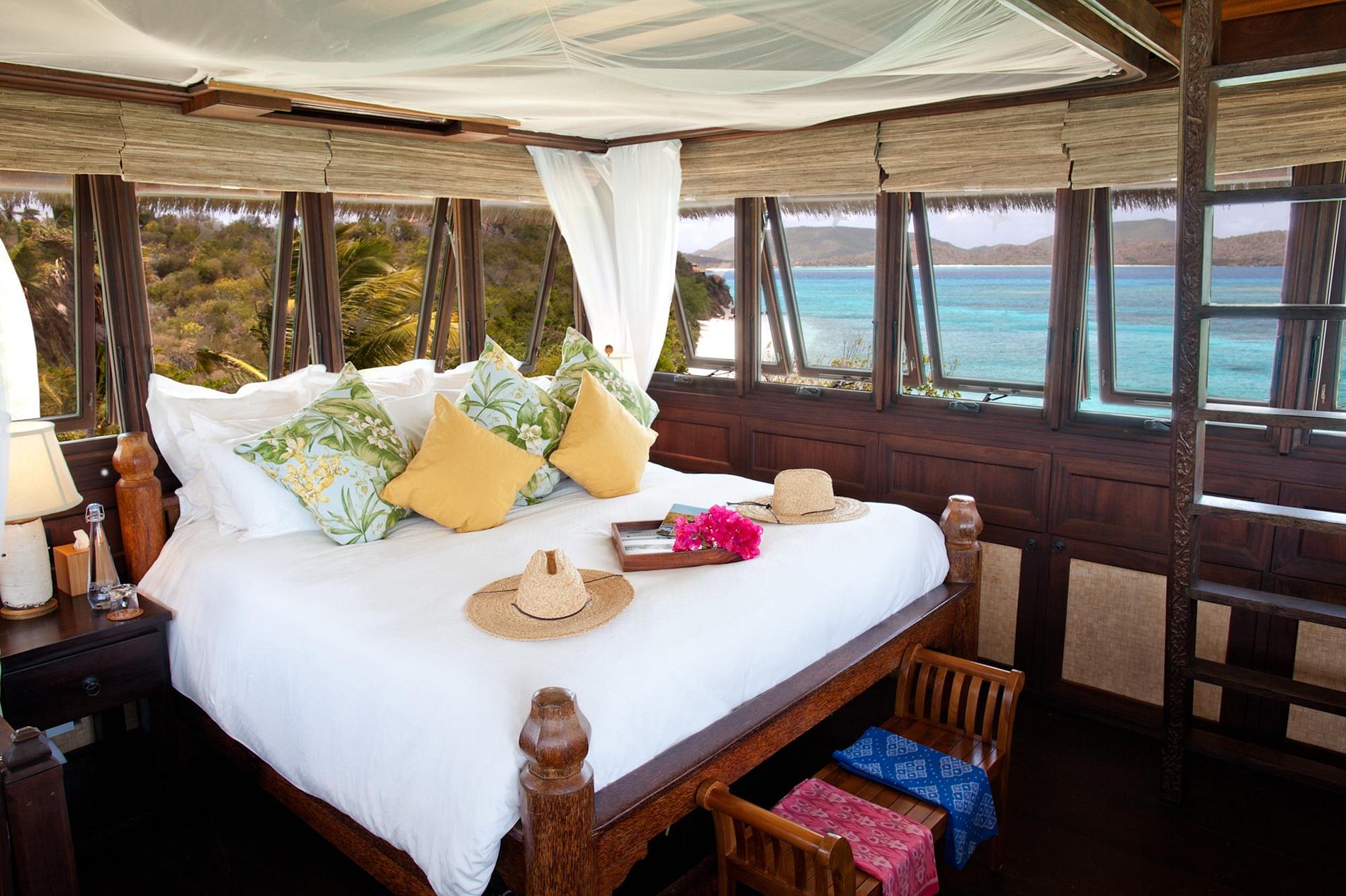 Cada quarto tem uma grande varanda com vista para o oceano ou da Necker Island. A cama king-size na maioria dos casos pode ser dividida em camas de solteiro, exceto o quarto 5. Todos os quartos possuem uma casa de banho com chuveiro e janelas que procuram o quarto para as vistas. Os quartos, 2, 3, 7, 8 e 9 também apresentam um chuveiro externo adicional na sua varanda. O quarto 9 é o nosso quarto com mais acessibilidade, com acesso sem degraus. Os quartos 2 e 3 e 7 e 8 se interligam, enquanto os quartos 4, 5 e 6 podem ser ligados.