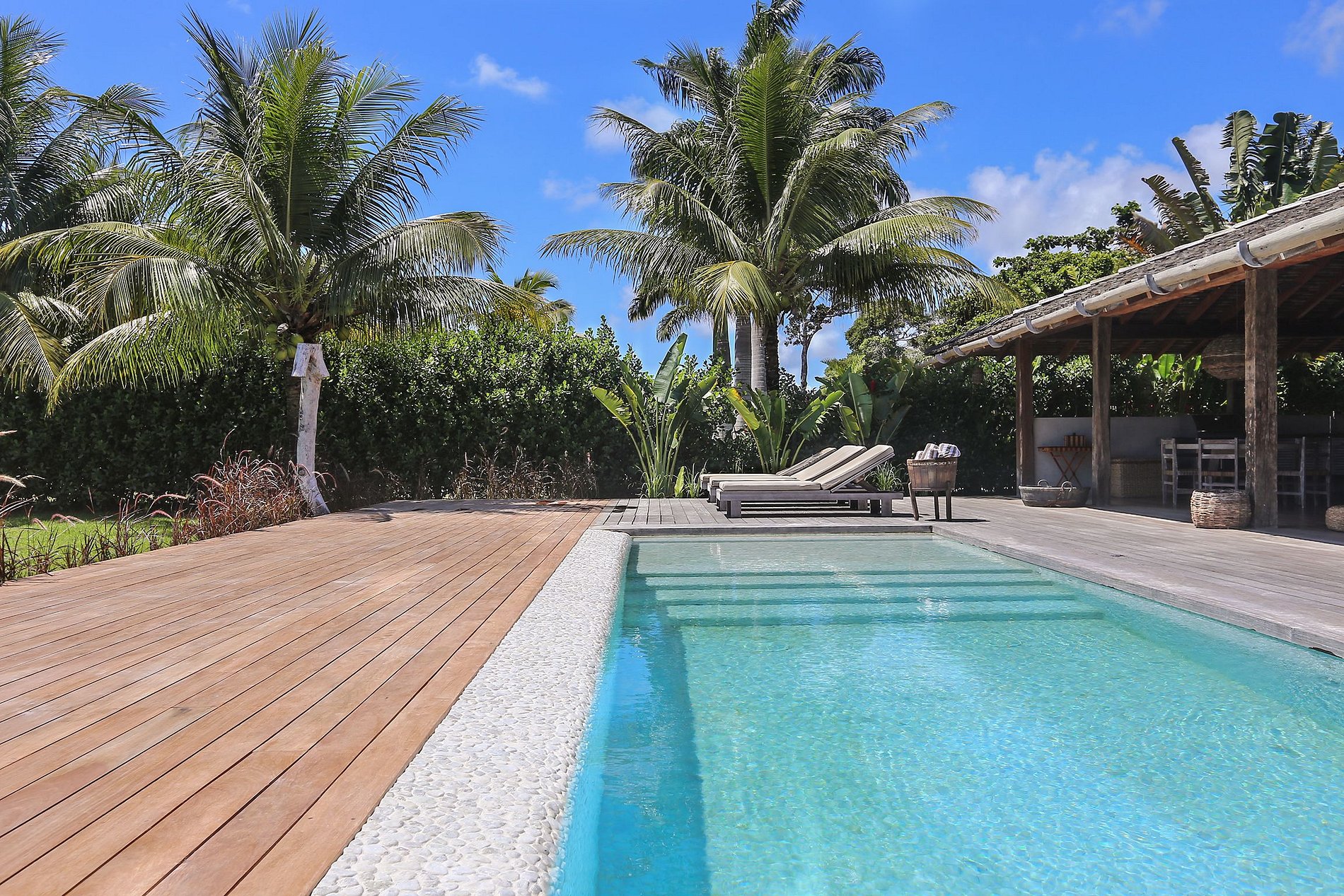 Entretenimento garantido na área externa com piscina, espreguiçadeiras e toalhas, além de área gourmet com um deleitável sofá, churrasqueira e mesas.