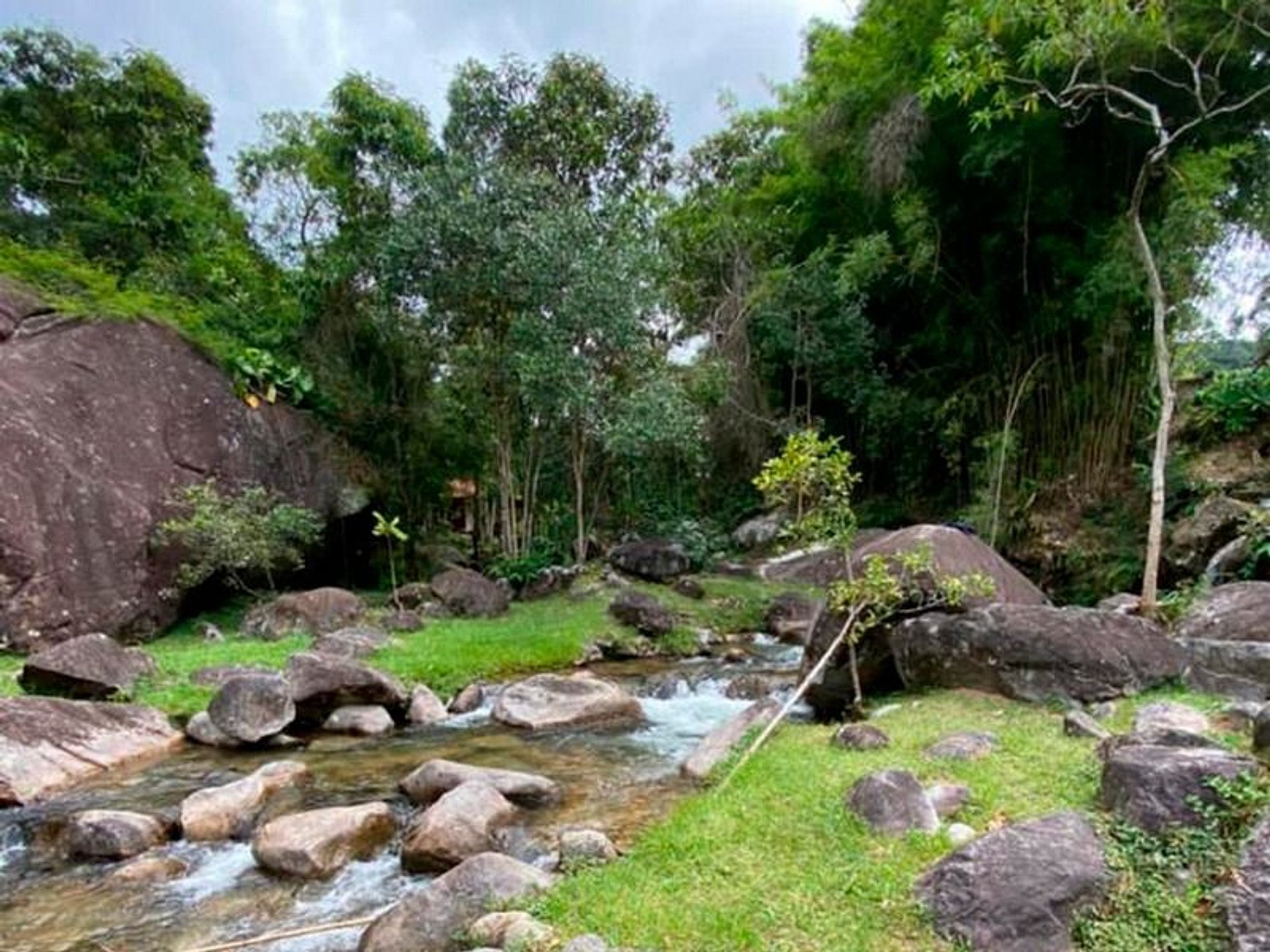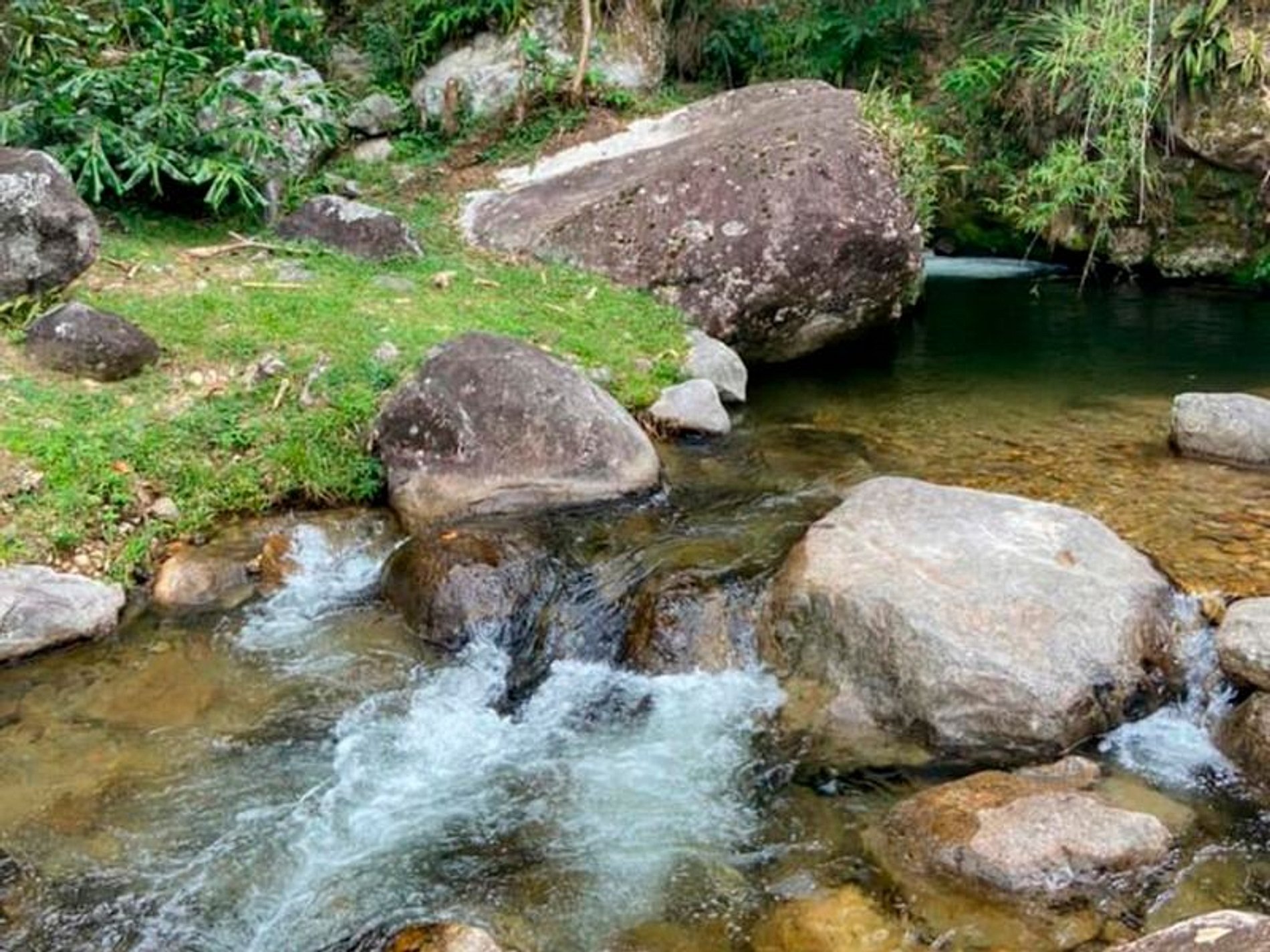 Os janelões de vidro e a aconchegante varanda, permitem apreciar a natureza e o rio com quedas d'águas e poços naturais que correm bem em frente ao chalé.