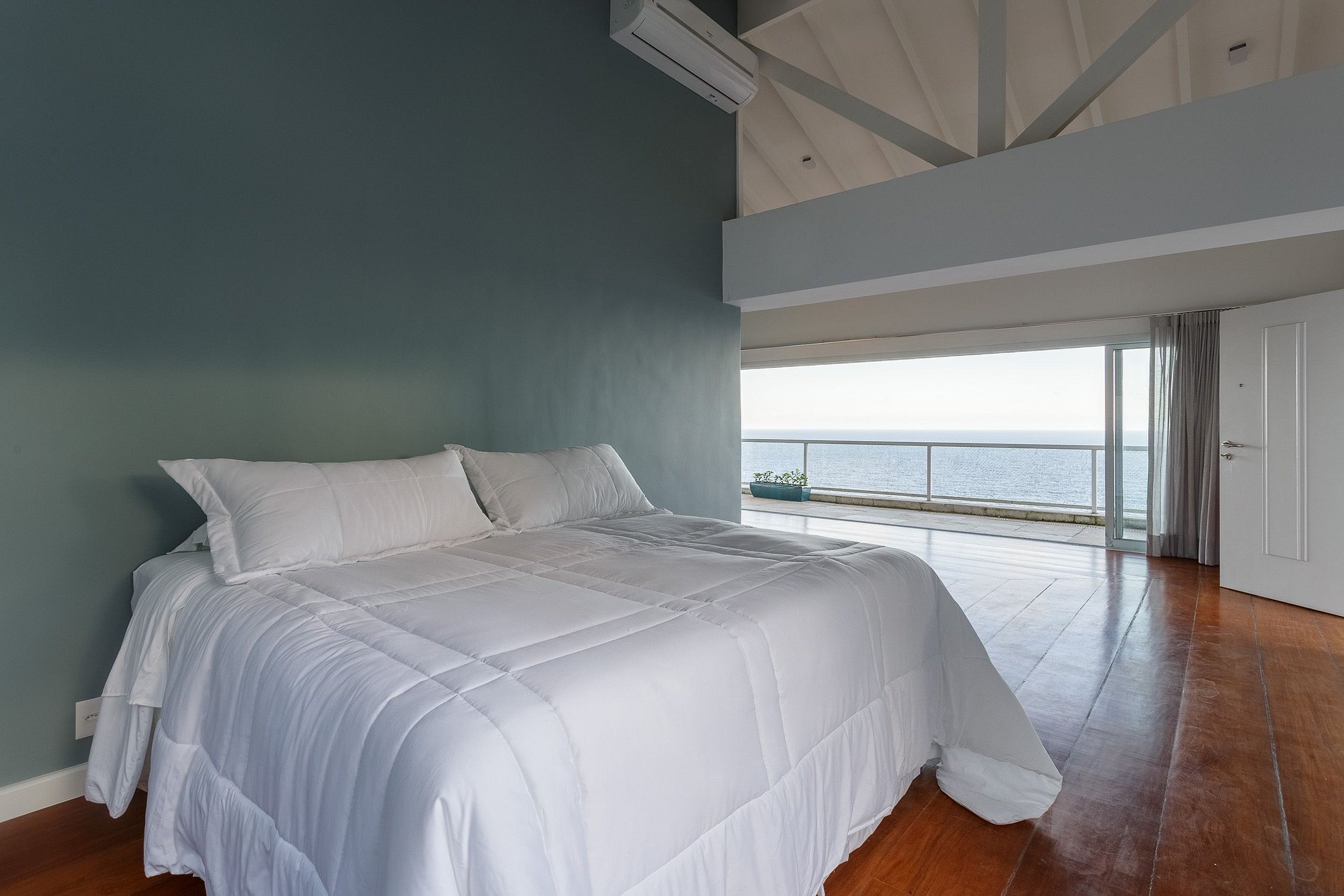 A suíte master é um lugar mágico, com cama king, frigobar, closet e uma deliciosa varanda que contempla a imensidão do mar e da cama a Pedra da Gávea; divina para um dia de noiva e suíte dos noivos.