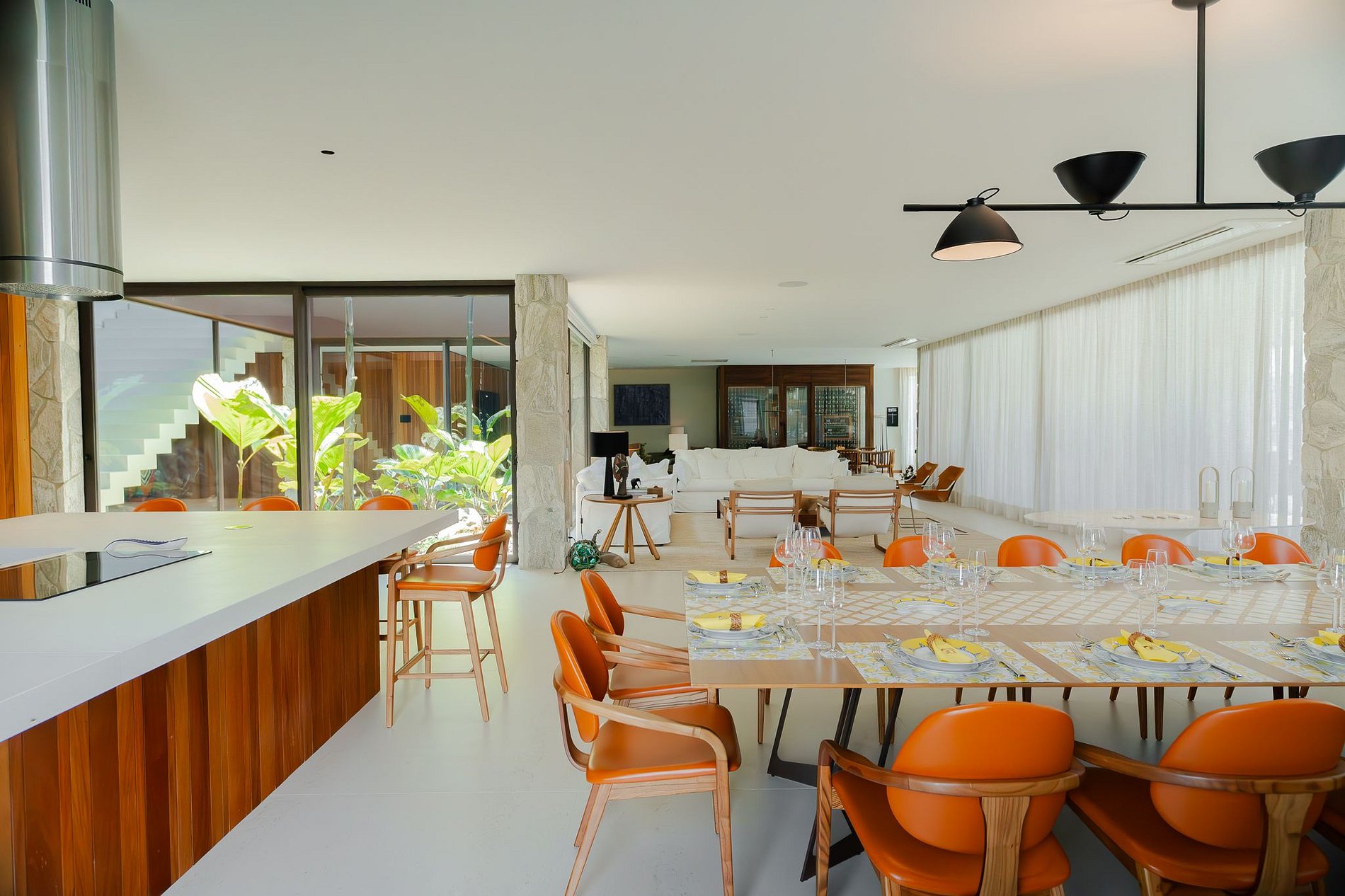 Portas de vidro acústicas deslizantes separam o espaço social da grande varanda gourmet, potencializando, quando abertas, a sensação de amplitude. A grande varanda gourmet tem bancada em dekton com fogão profissional, forno de pizza a lenha da Fornoflex, ambiente de estar, e acomodações para 19 pessoas sentarem para refeições, na mesa redonda com nove lugares e na bancada.