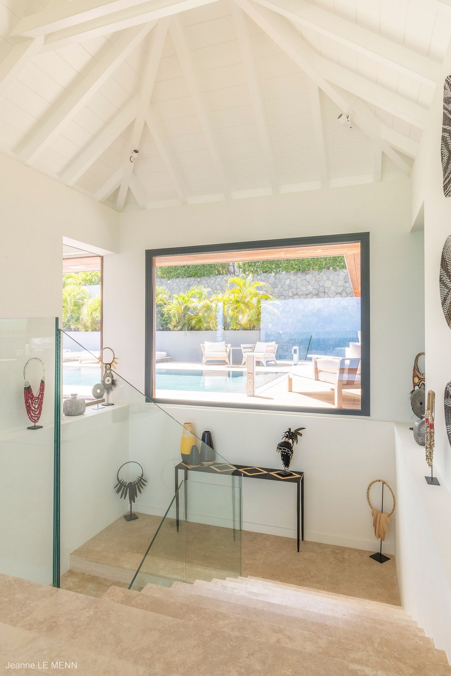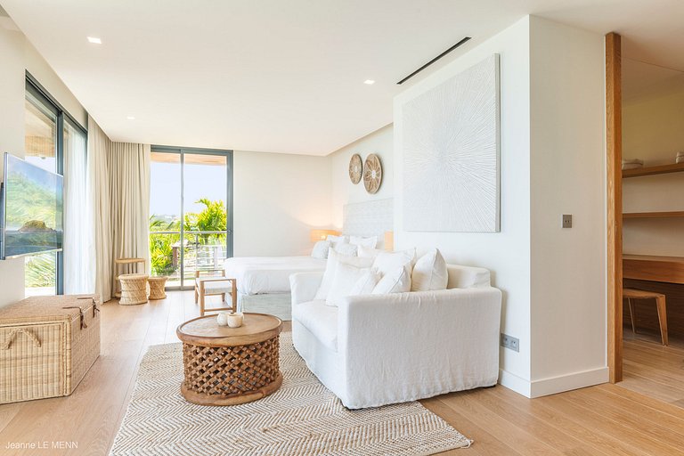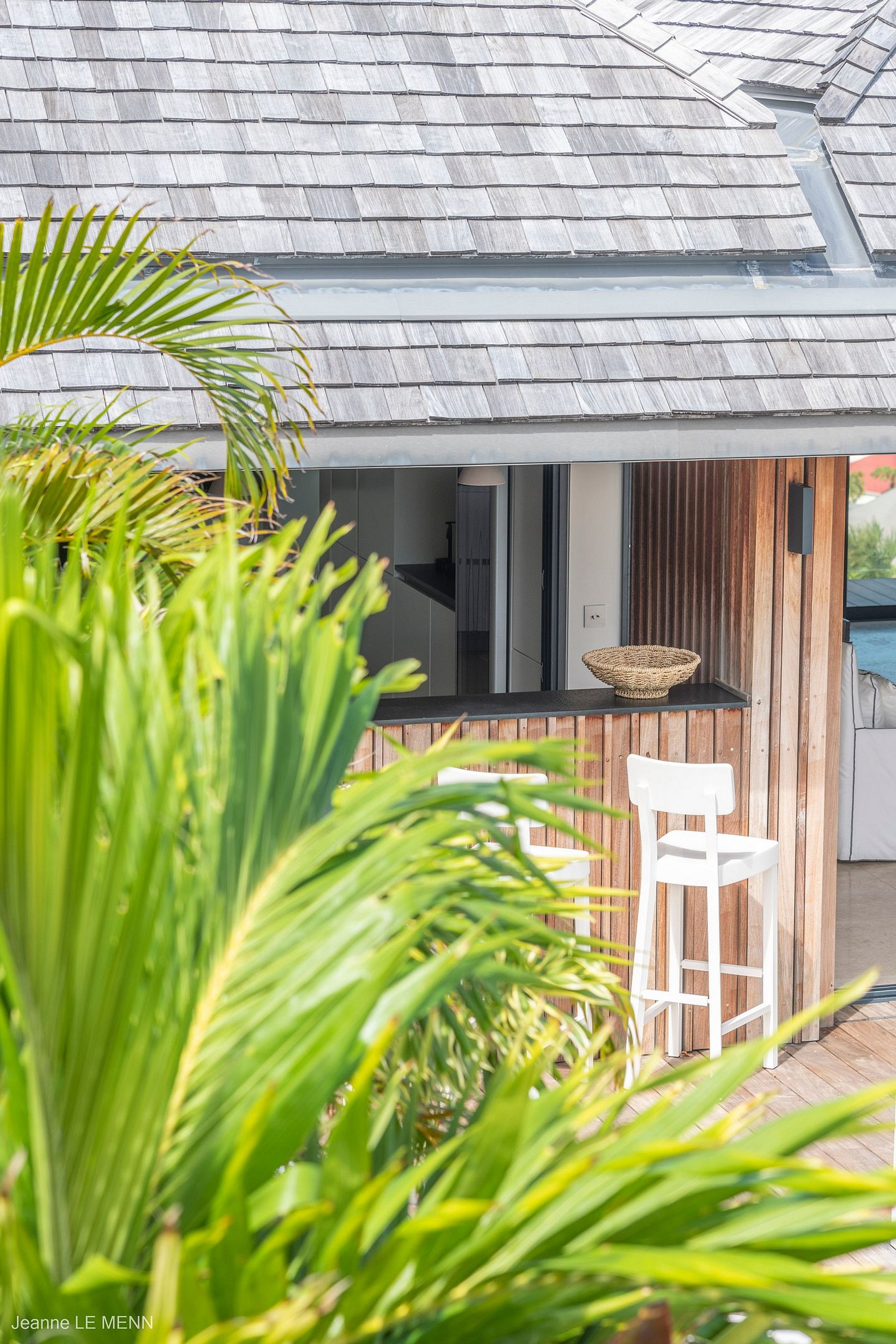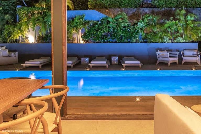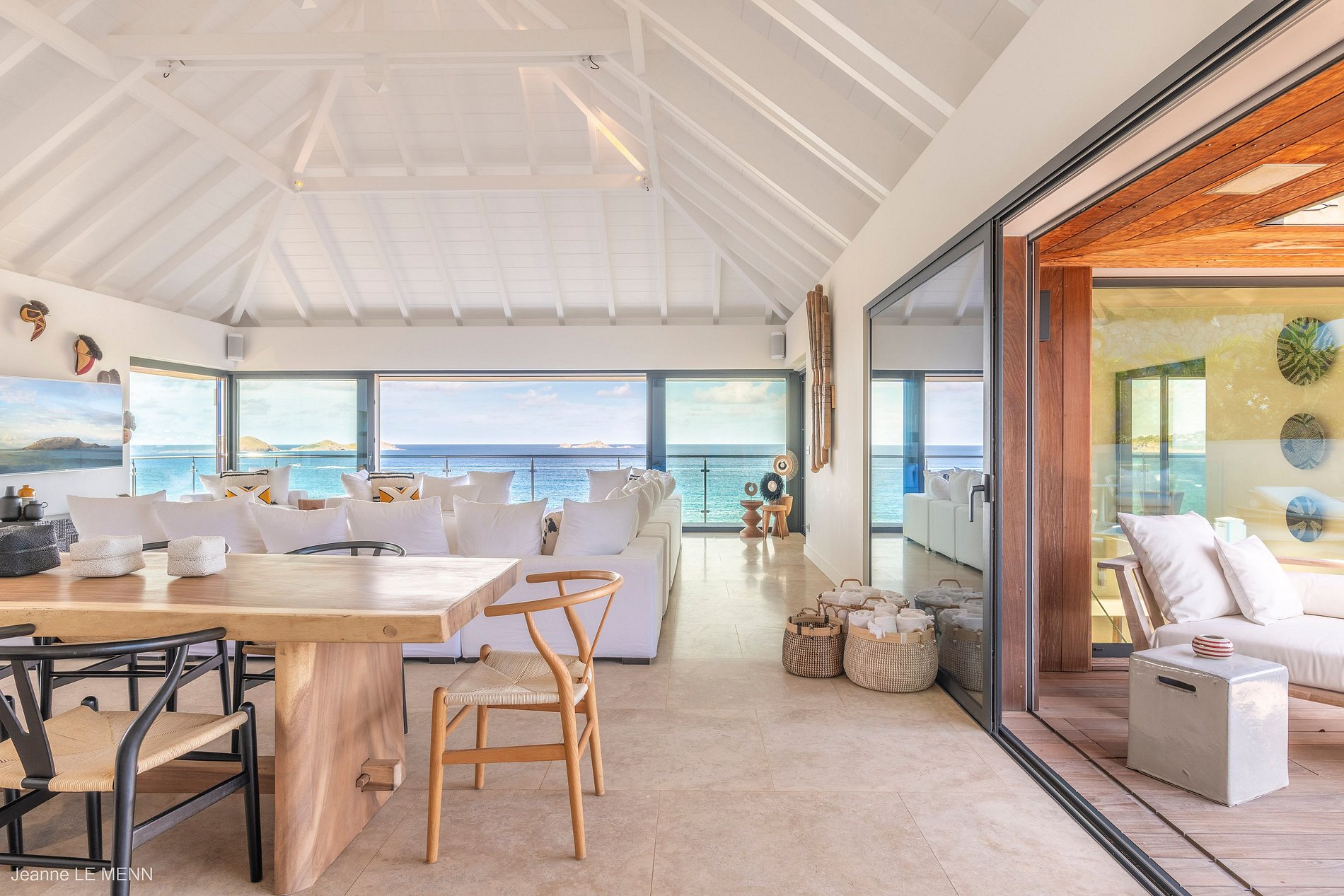 Falando no bar, este conecta a parte interior com a parte exterior da casa, integrando a área da deslumbrante piscina e sua vista imponente de Anse des Cayes, a cozinha gourmet e a sala de estar principal. A sala tem três paredes de vidro que podem ser abertas, dando a sensação de continuidade até o espaço ao ar livre. Possui uma mesa de jantar de madeira e uma TV com sistema satélite dos EUA e Apple TV.