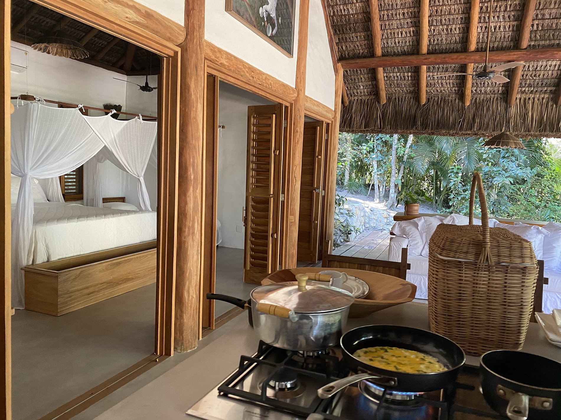 Com ar aconchegante e convidativo, cercado de muito verde e com uma vista espetacular. Sala e cozinha são ao ar livre e integradas a uma varanda bem grande com uma vista incrível do mar, perfeito para aproveitar os melhores momentos em família em contato com a natureza.