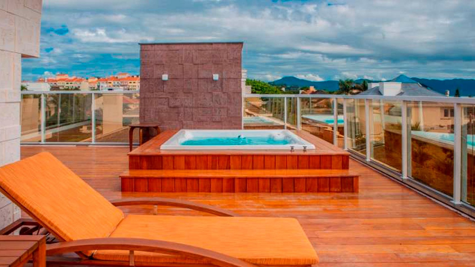 Área externa com piscina com cascata, 2 banheiras de hidromassagem, jardim frontal, varanda e terraço mobiliado com vista magnifica para o mar.
