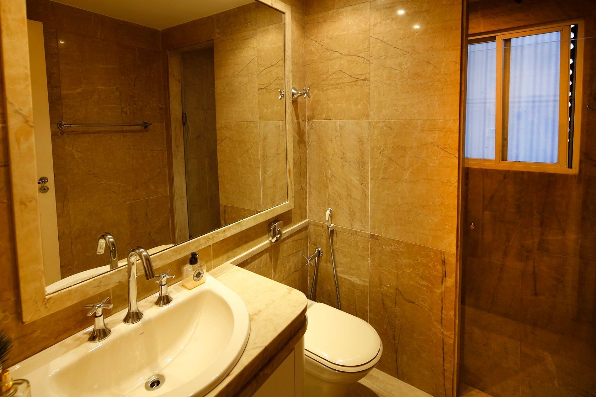 São 3 suítes com cama de casal e 1 escritório reversível em quarto com sofá cama e banheiro ao lado. Além de mais 2 quartos de funcionários com um banheiro.