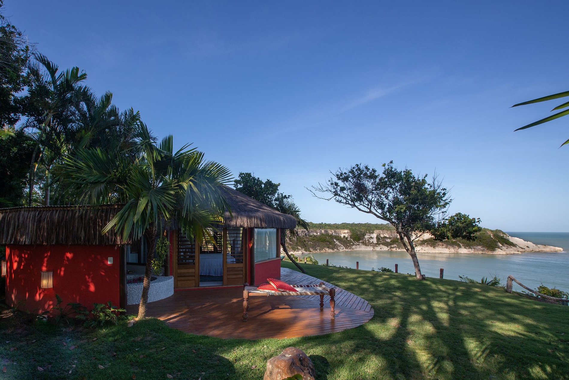 Com apenas quatro bungalows e uma casa rústico-chique a arquitetura é pra lá de elegante, em meio a um jardim de coqueiros e uma vista deslumbrante para o mar, avistando-se a Ponta de Juacema e Corumbau.