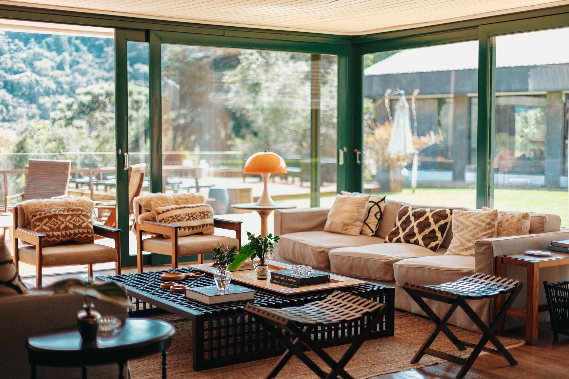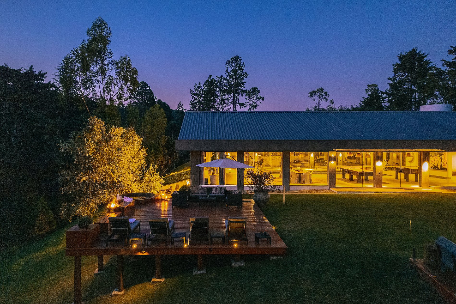 Na área externa há 2 decks para relaxar ao ar livre, um com espreguiçadeiras e ofurô e o outro com sofás e lareira externa. A propriedade possui também um galpão com mesa de snooker e pebolim, sauna úmida e piscina aquecida.