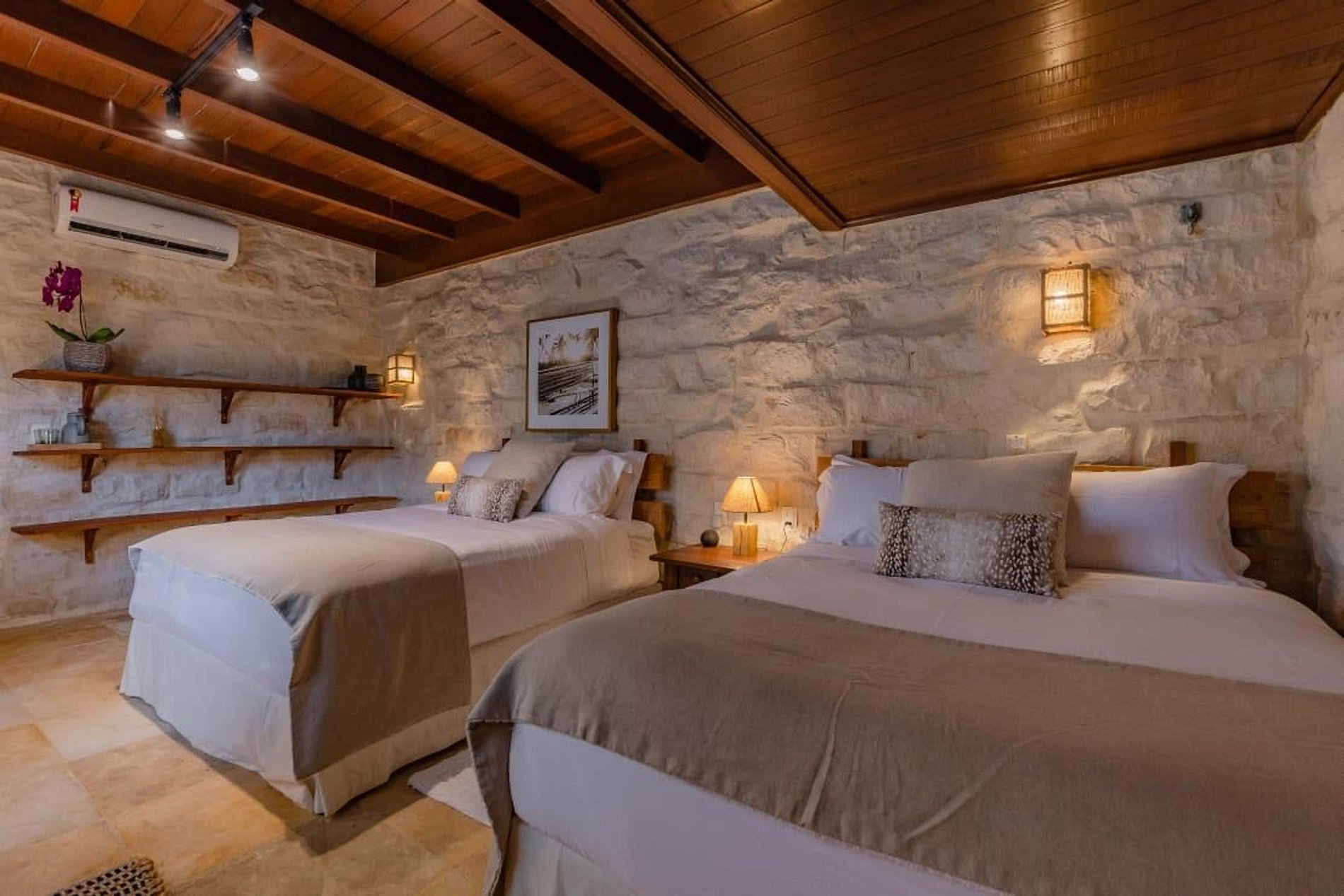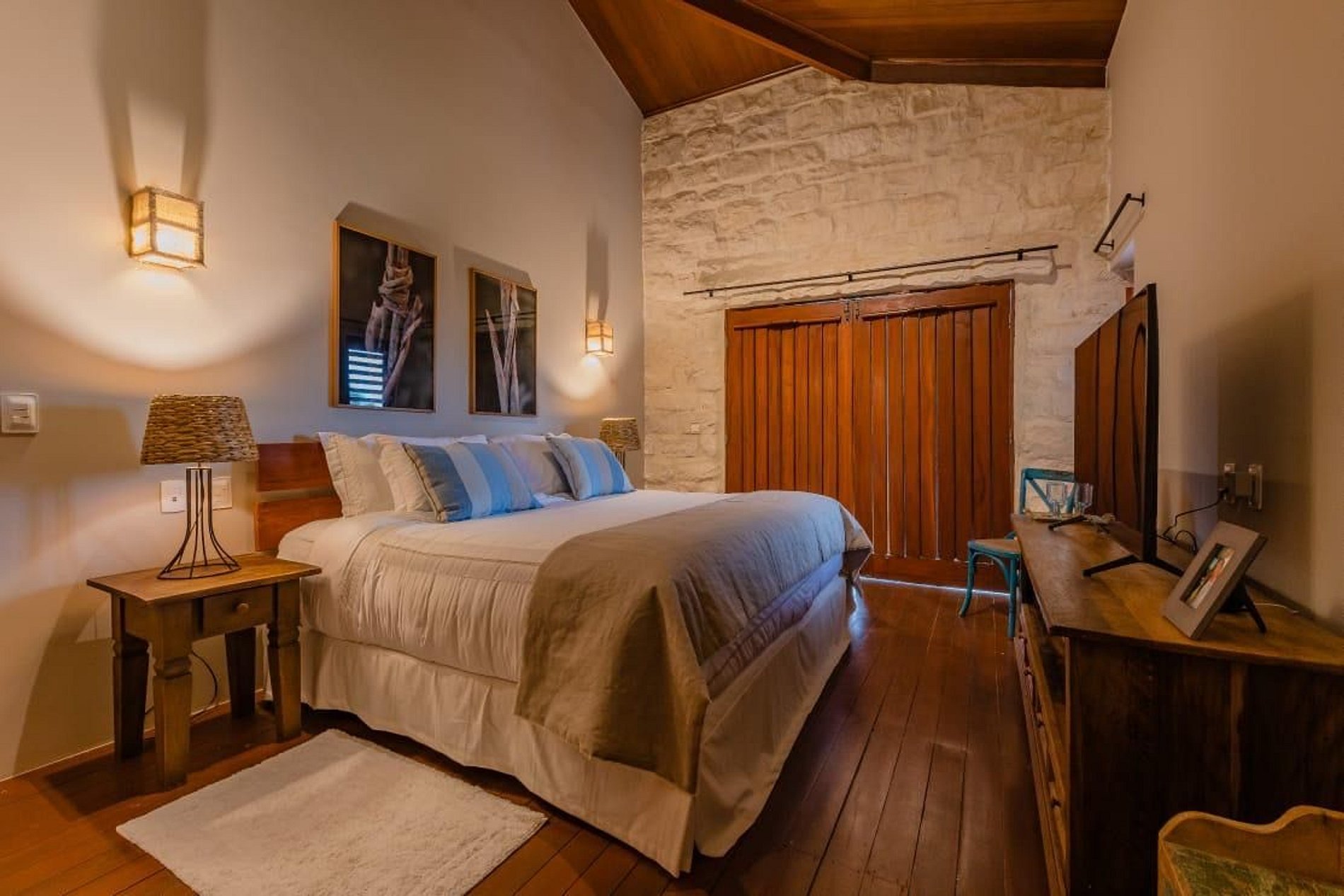 A casa possui 5 suítes e cada uma delas foi projetada para proporcionar conforto, equipadas com mobiliário de design, roupas de cama 600 fios, travesseiros de pluma, ar-condicionado, toalhas gigantes trousseau, amenities de banho, secador de cabelo e caixa de som alexa.