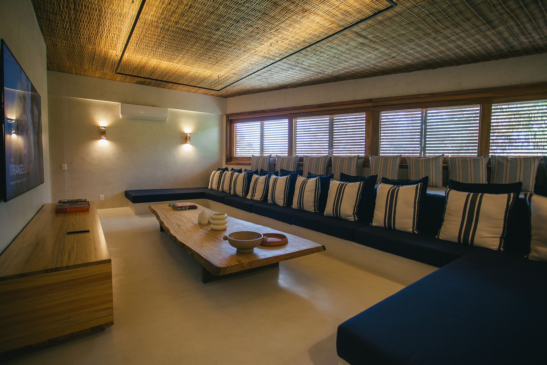 Pé na areia, a casa conta com uma piscina com uma vista espetacular para o mar, churrasqueira, forno a lenha, academia, spa (com sauna e ofurô), além de quadras de beach tennis e mesa de ping-pong.