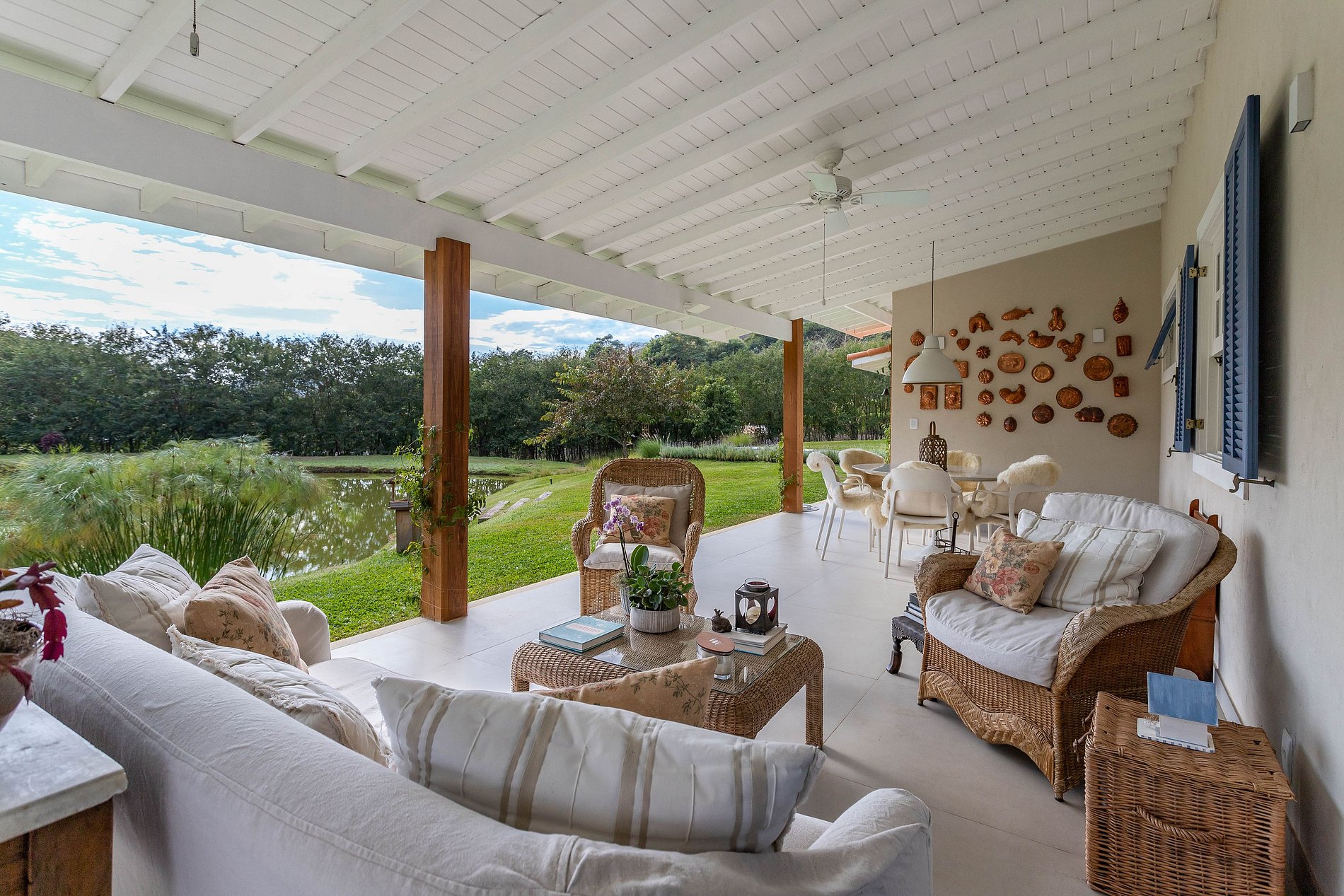 Varanda, sala e cozinha praticamente formam um único espaço e para coroar, todos esses ambientes estão voltados para um charmoso lago.