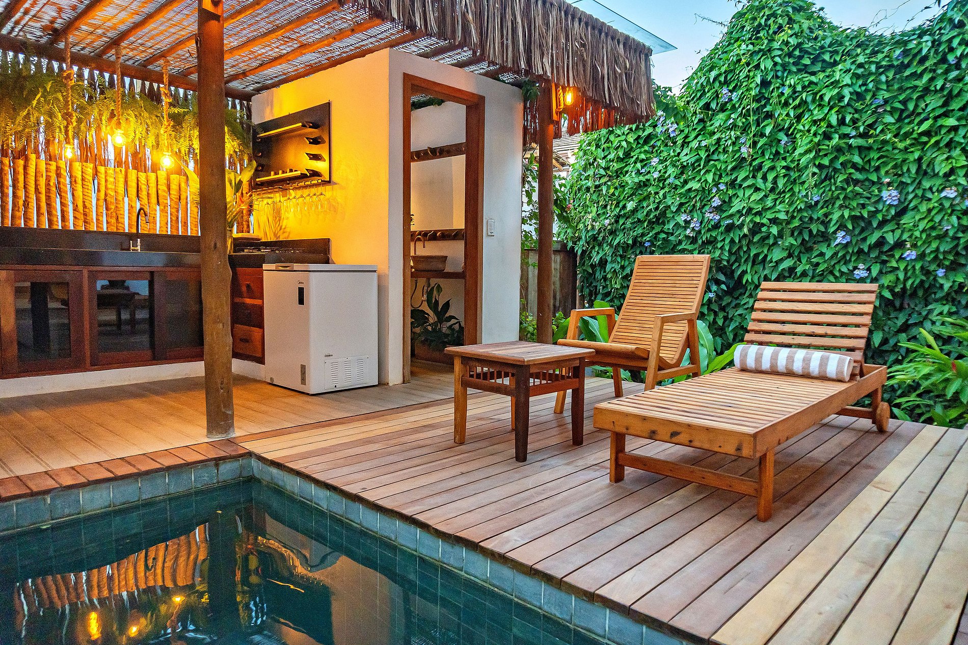 - Piscina com hidro revestida em pedra Hijau de origem vulcânica, que mantem a temperatura durante a noite. E uma queda em cascata do pergolado.
