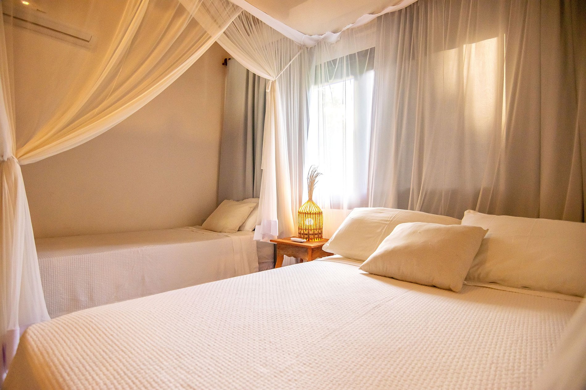 Todas as 4 suítes possuem ar-condicionado, lavatórios e banheiros separados, áreas confortáveis com deck ou varanda, vistas relaxantes da piscina. A suítes no térreo têm acesso direto ao exterior, à piscina, ao deck e a sala de Estar, Jantar e cozinha integrada. As outras 03 suítes no andar de cima são , amplas e confortáveis, com vista para a piscina a partir das varandas.