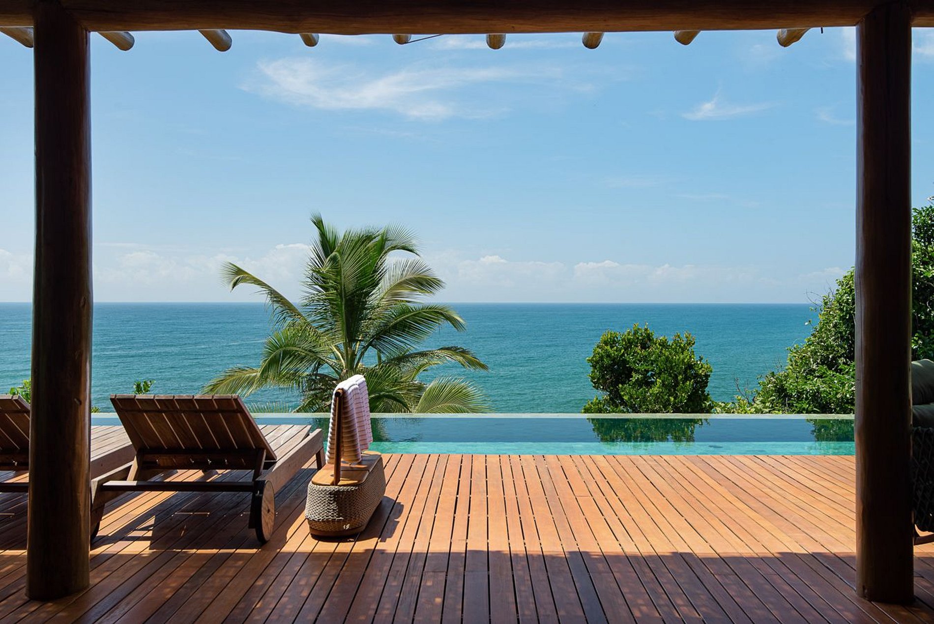 A piscina com vista mar, se mistura ao jardim de Mata Atlântica nativa.