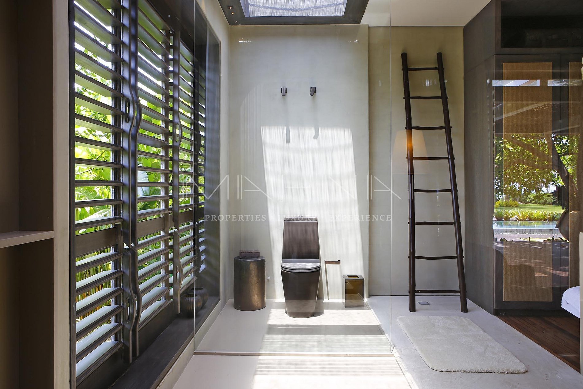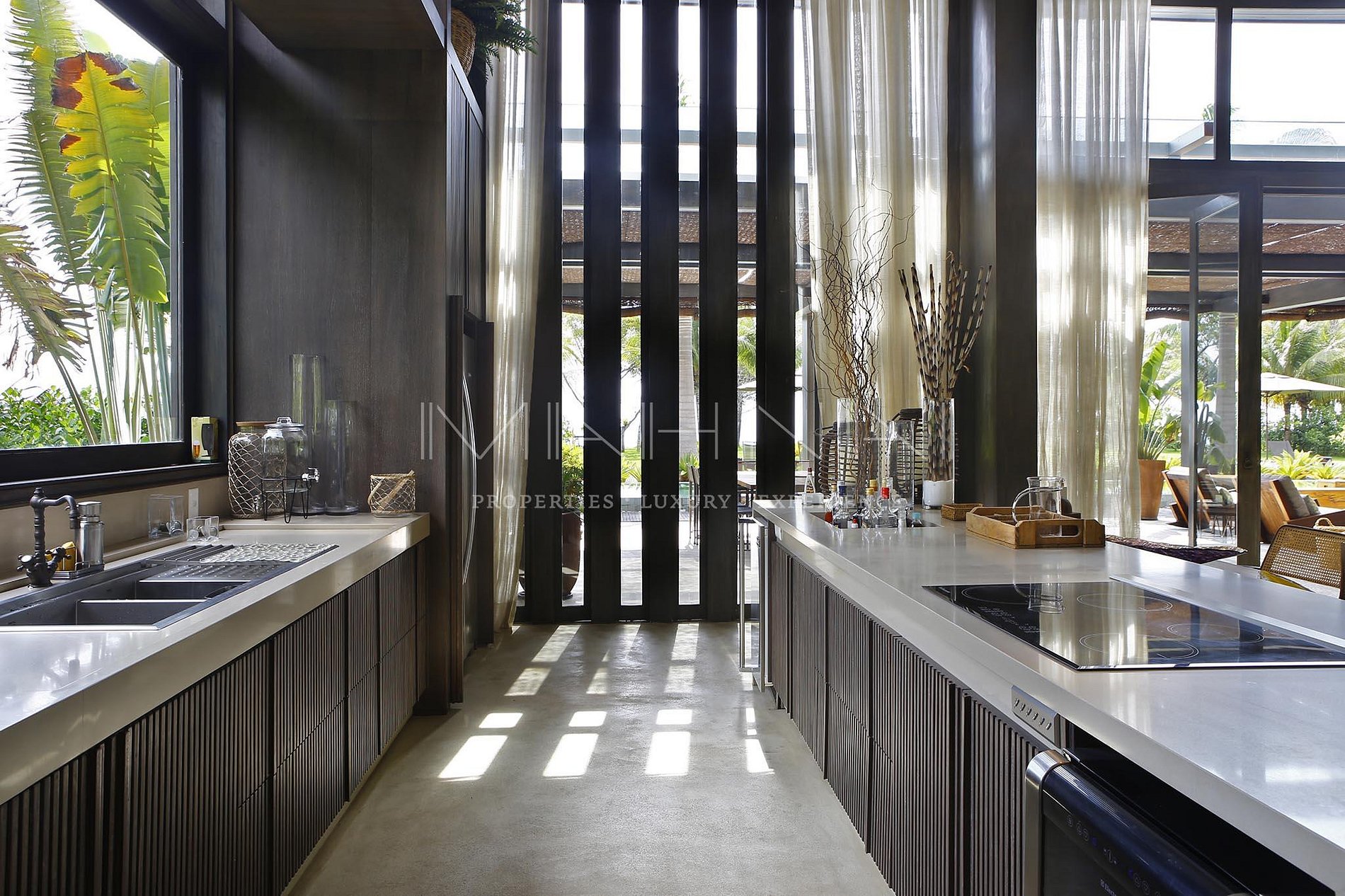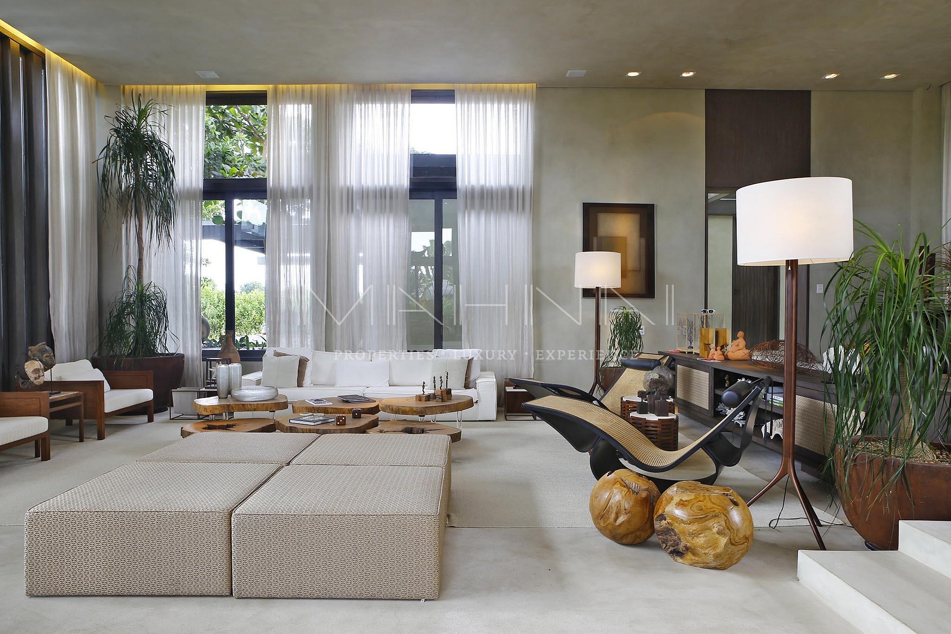 A casa está dividida em dois blocos, sendo um a parte social, com pé direito de 5 metros de altura onde estão lavabo, hall, living, jantar, varanda, piscina, cozinha gourmet e cozinha de apoio. No outro bloco, parte reservada aos quartos, divididos em uma suíte máster e 4 suítes de hóspedes. Nesse mesmo bloco ainda estão localizados a lavanderia (estrutura completa) e o banheiro de colaboradores.
