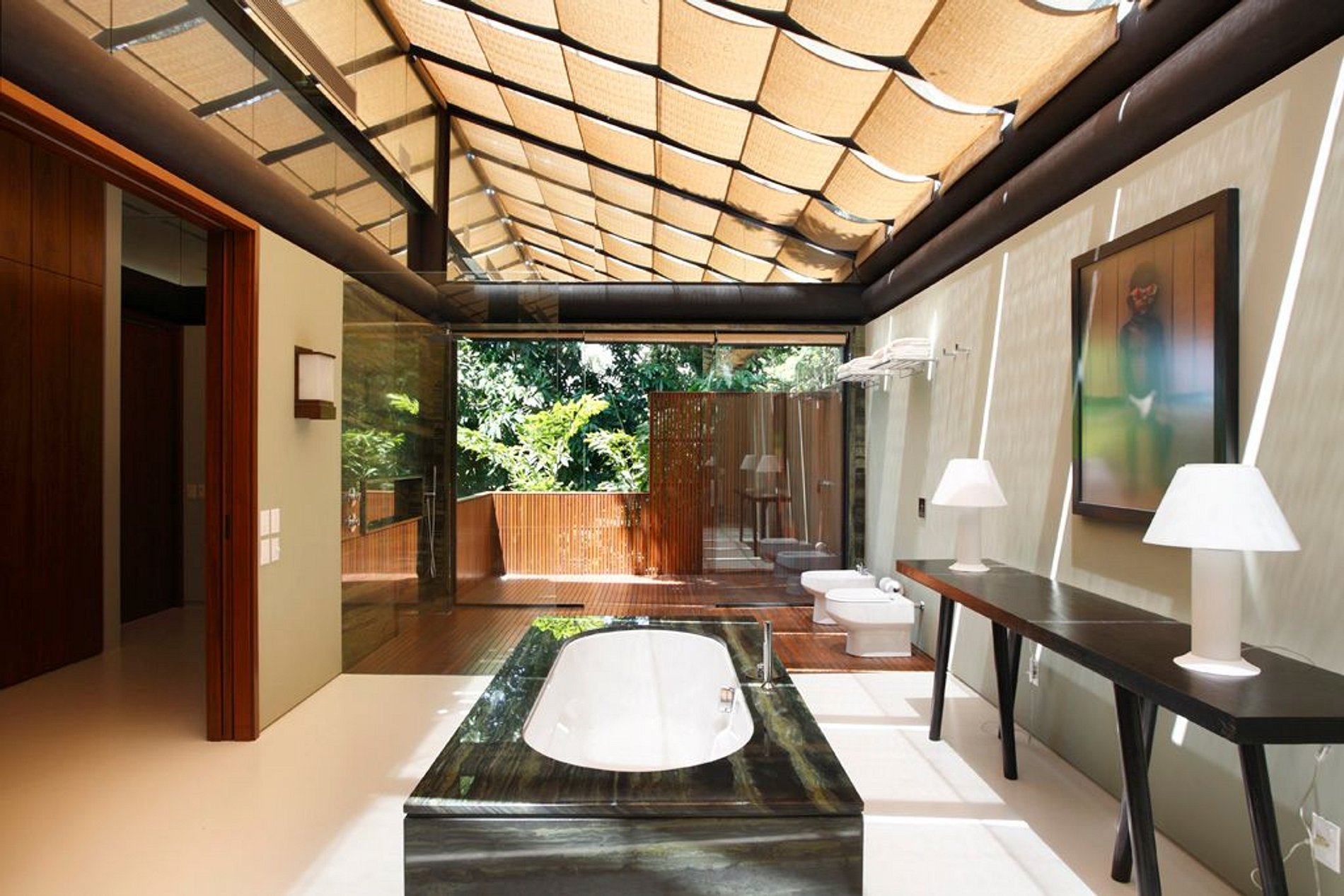 No interior, a casa tem uma suíte master com closet, escritório e uma jacuzzi. Além disso, a casa conta com mais três Suites de hóspedes.