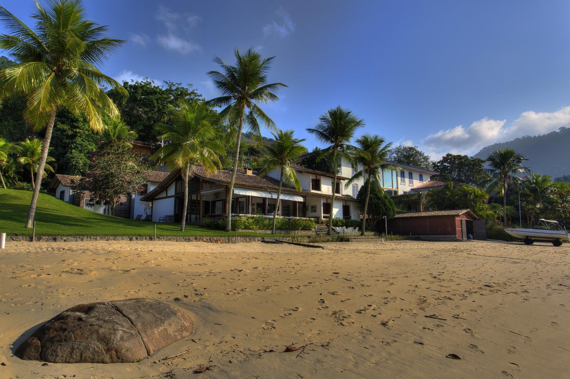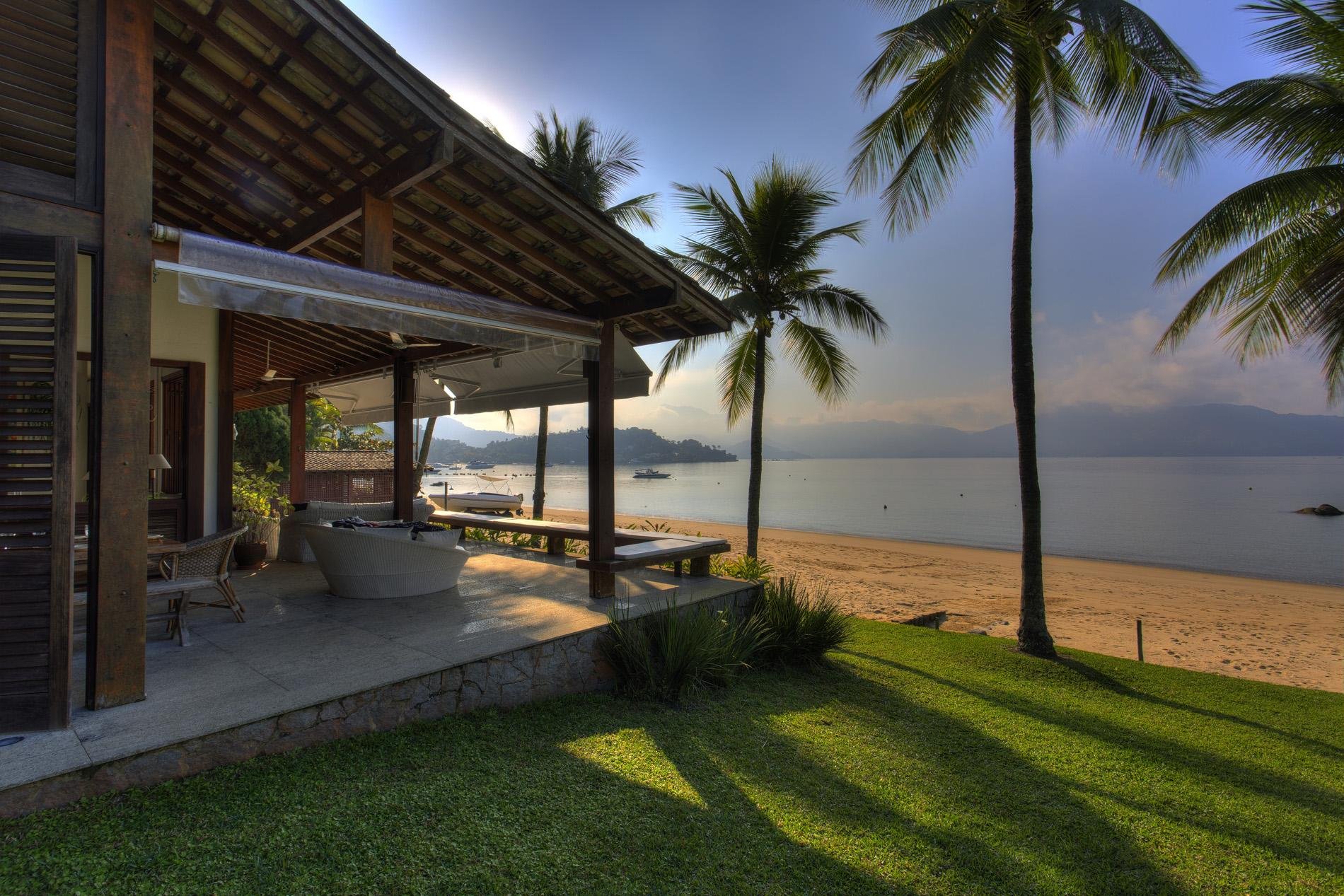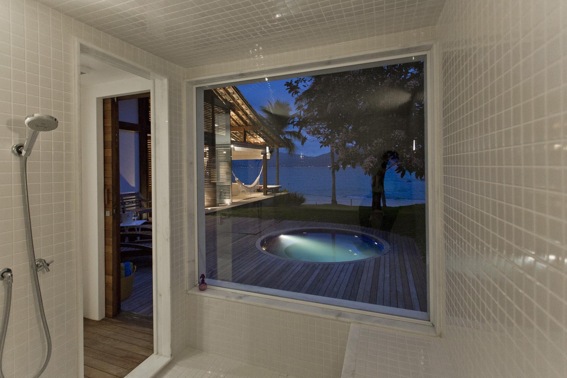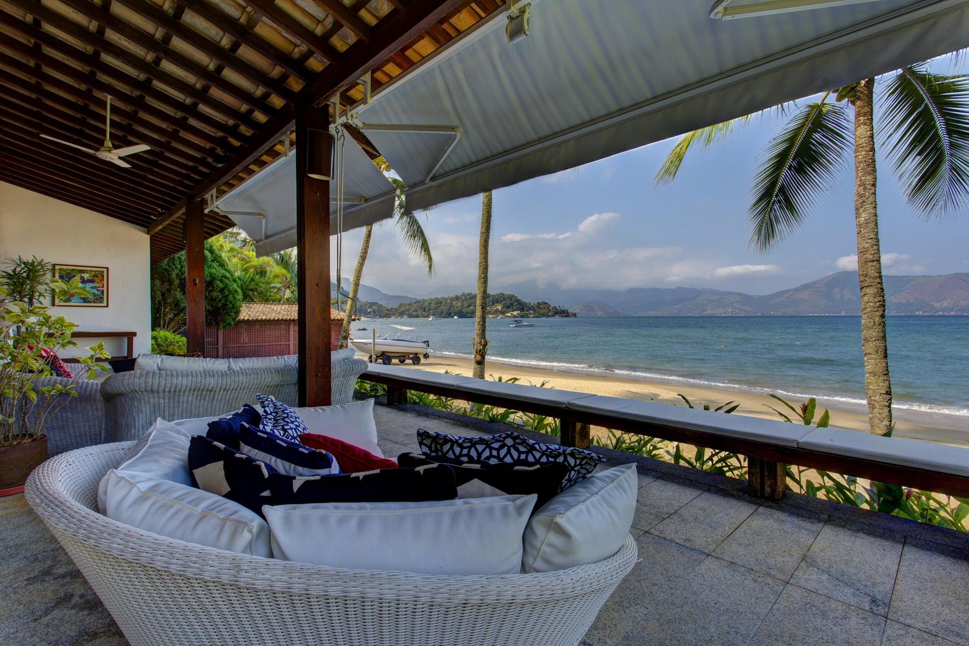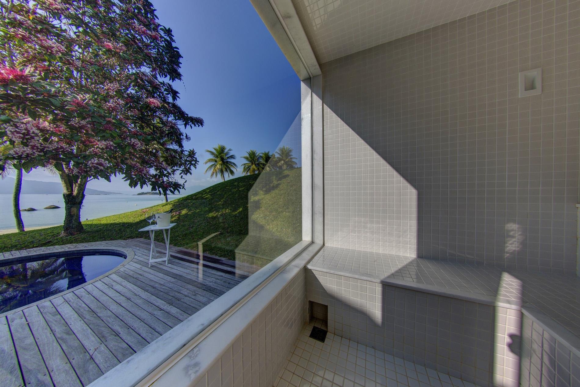 A casa dispõe de 3 salas com sofás confortáveis, TV, sauna úmida e jacuzzi com vista para o mar, além de uma churrasqueira portátil à disposição. A voltagem da casa é 110v. Sinal de celular e wi-fi constantes. Oferece heliponto na praia.
