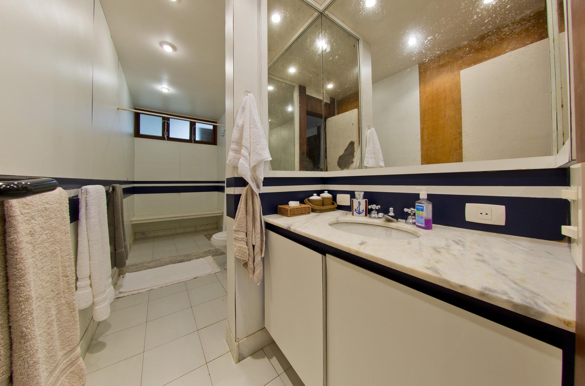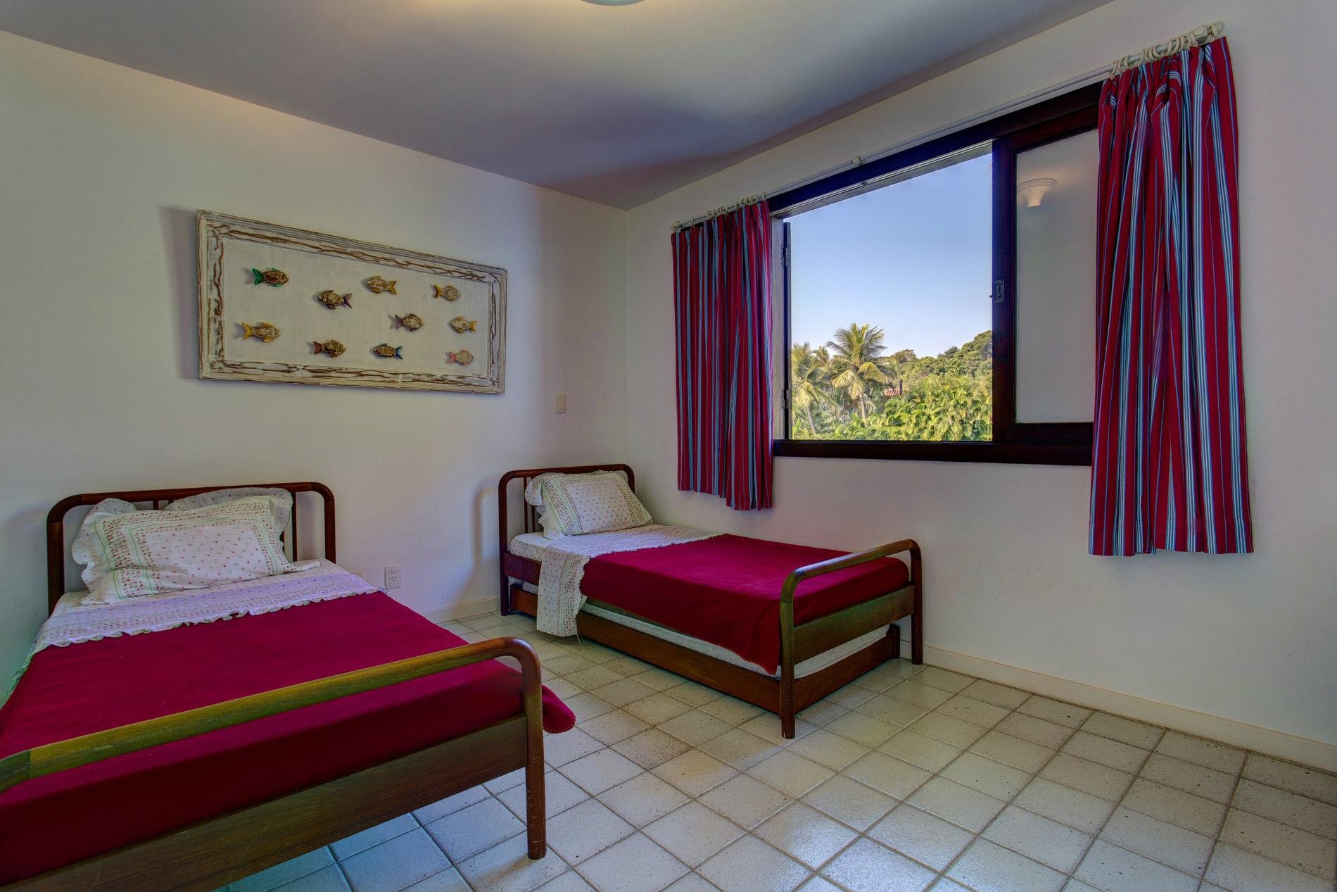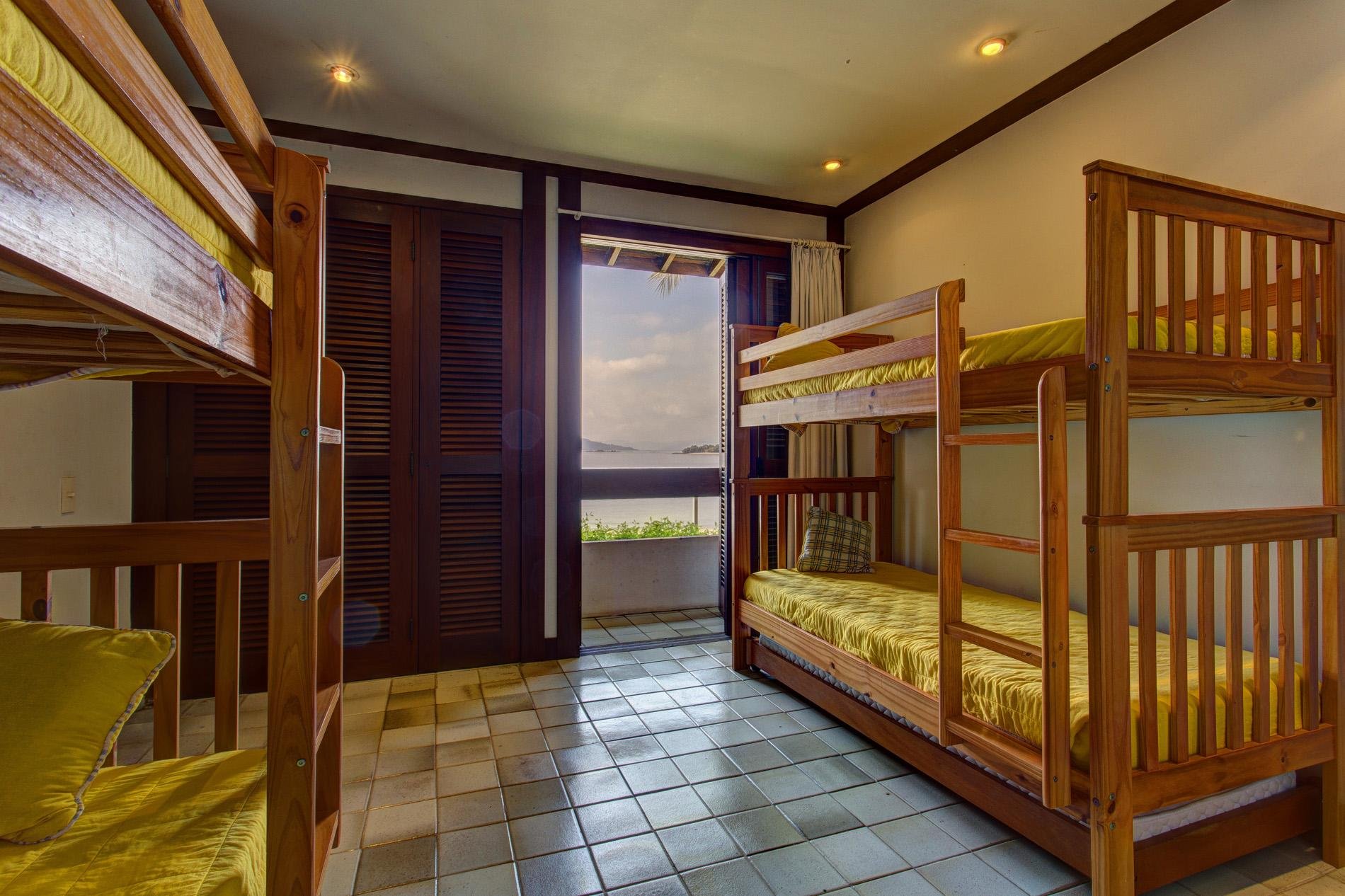 Para acomodar as crianças/adolescente, mais 3 suítes com camas de solteiro, beliche e bicama. E um quarto com cama de solteiro e 1 berço (banheiro em frente).