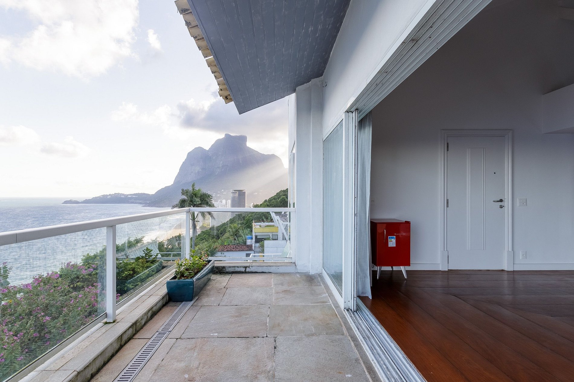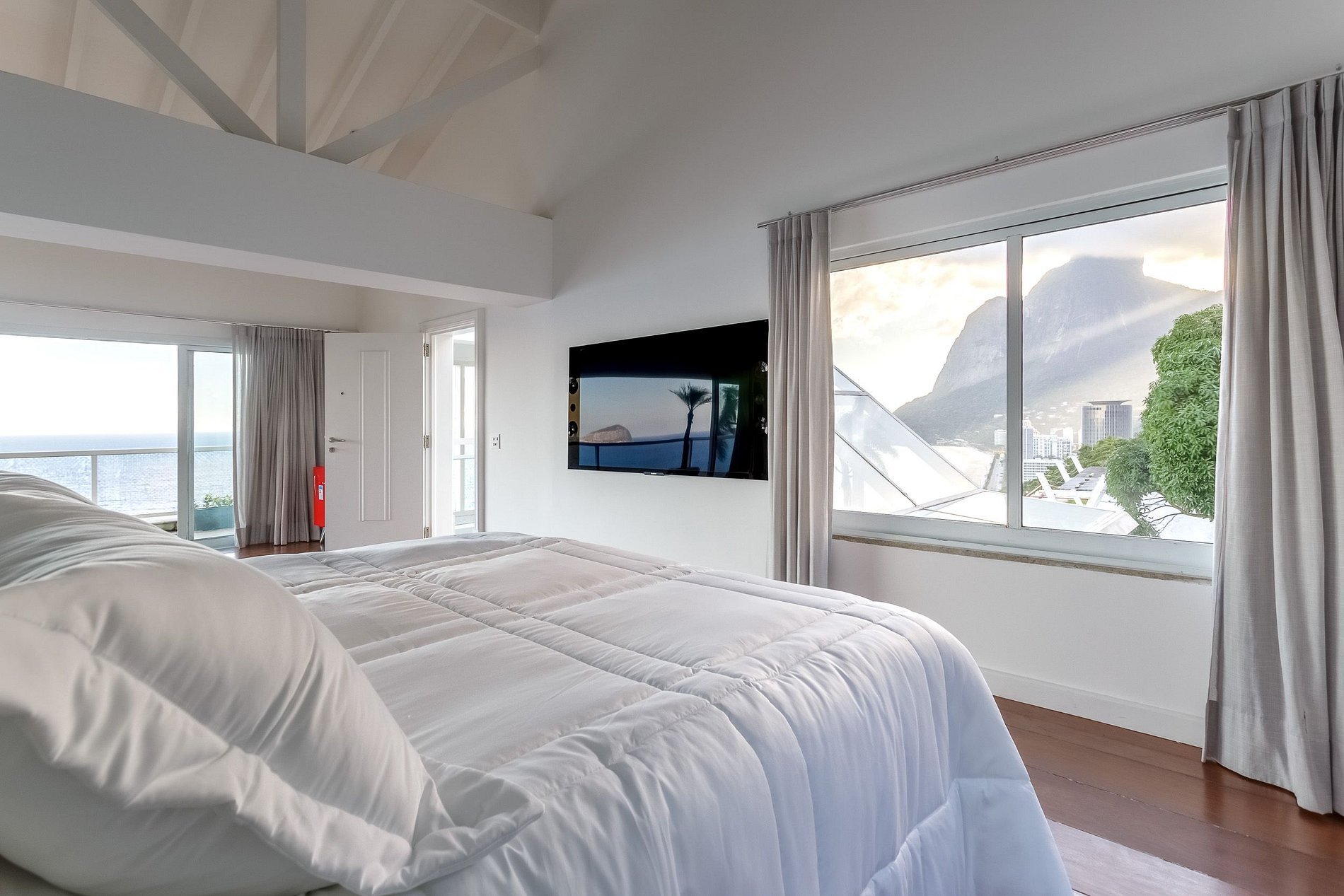 A suíte master é um lugar mágico, com cama king, frigobar, closet e uma deliciosa varanda que contempla a imensidão do mar e da cama a Pedra da Gávea; divina para um dia de noiva e suíte dos noivos.