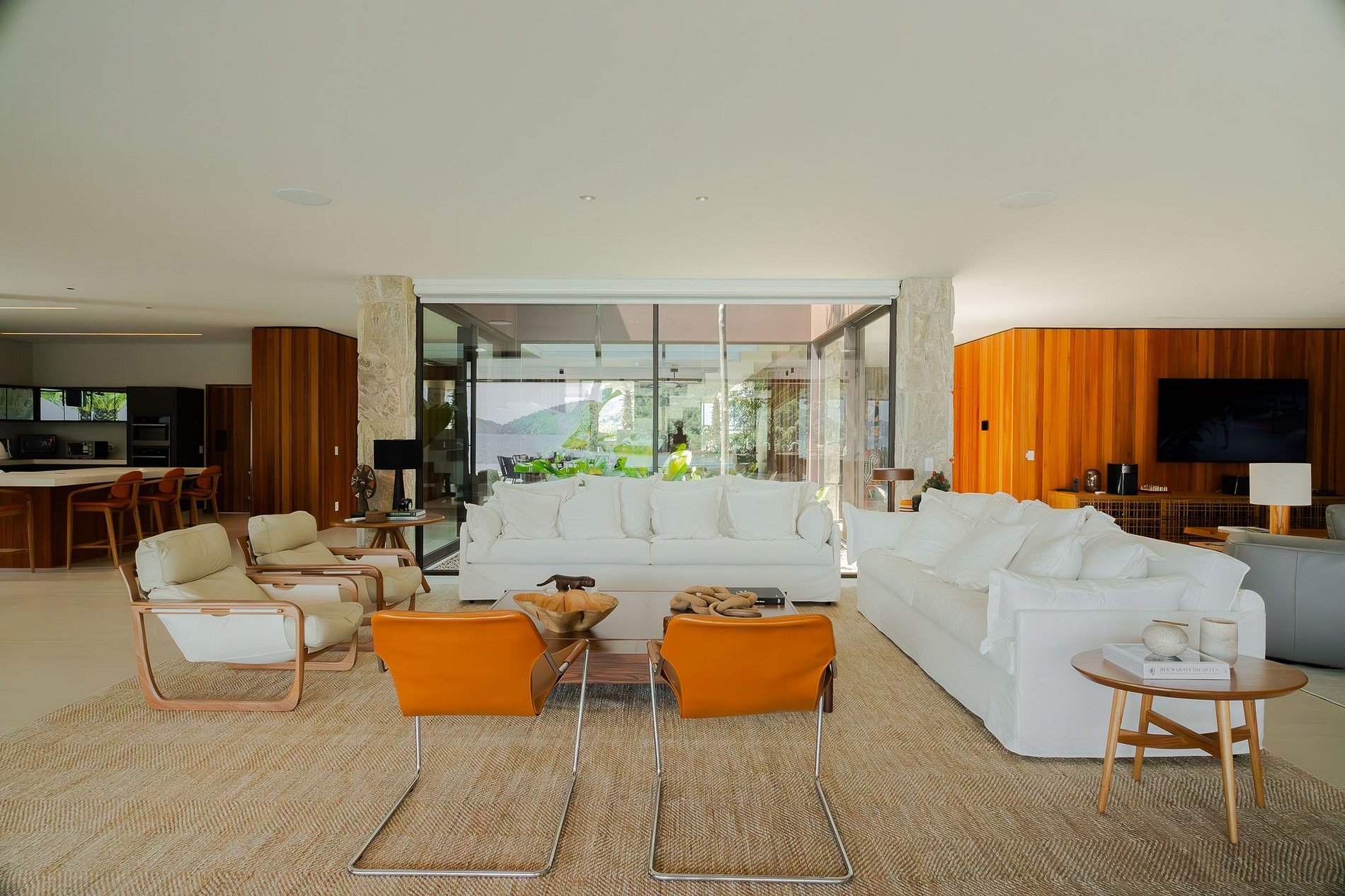 A decoração dos ambientes sociais é de mobiliário brasileiro consagrado, com peças criadas pelos mais renomados designers do país. Belos quadros de qualidade artística adornam as paredes, e são um requinte a mais da residência.