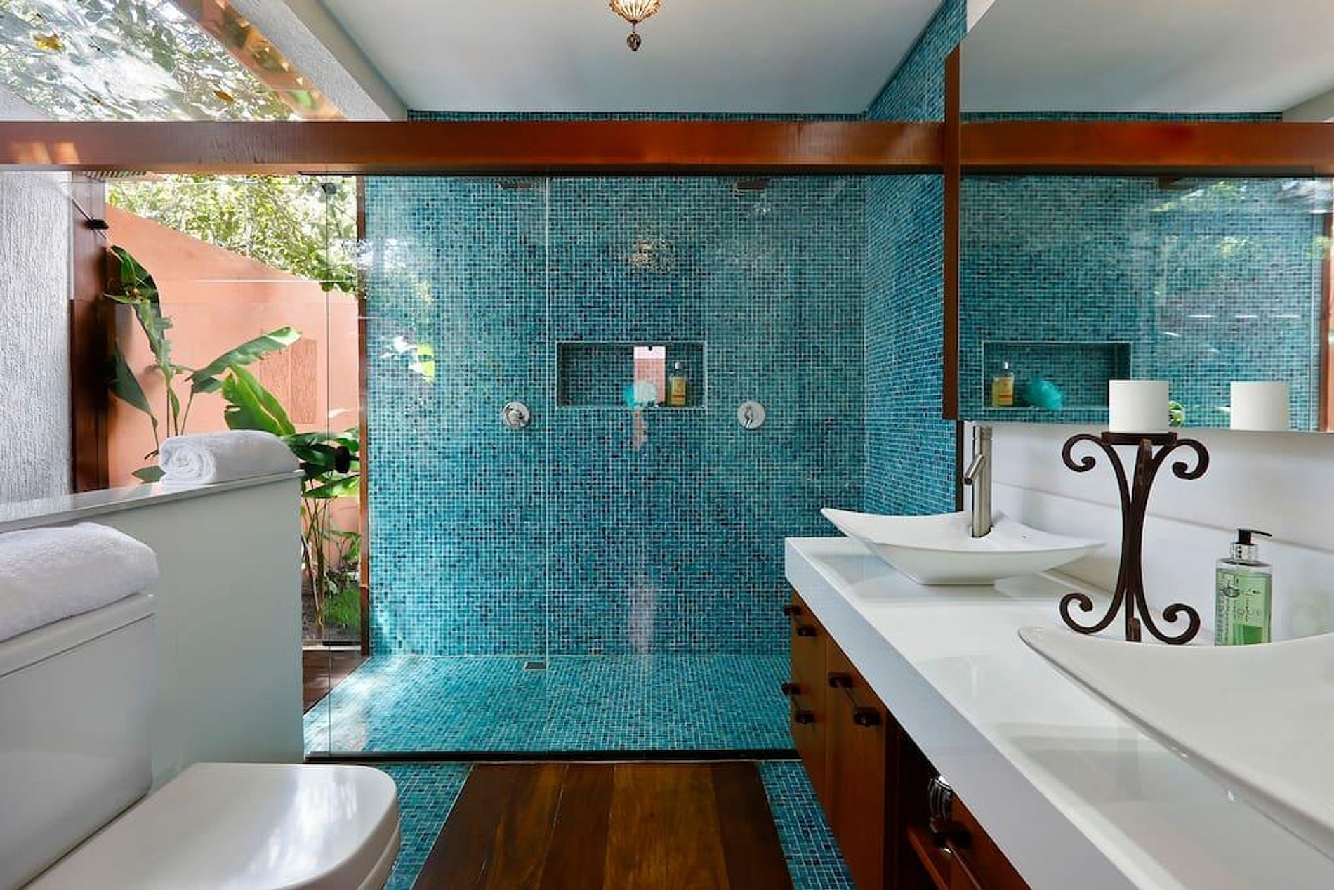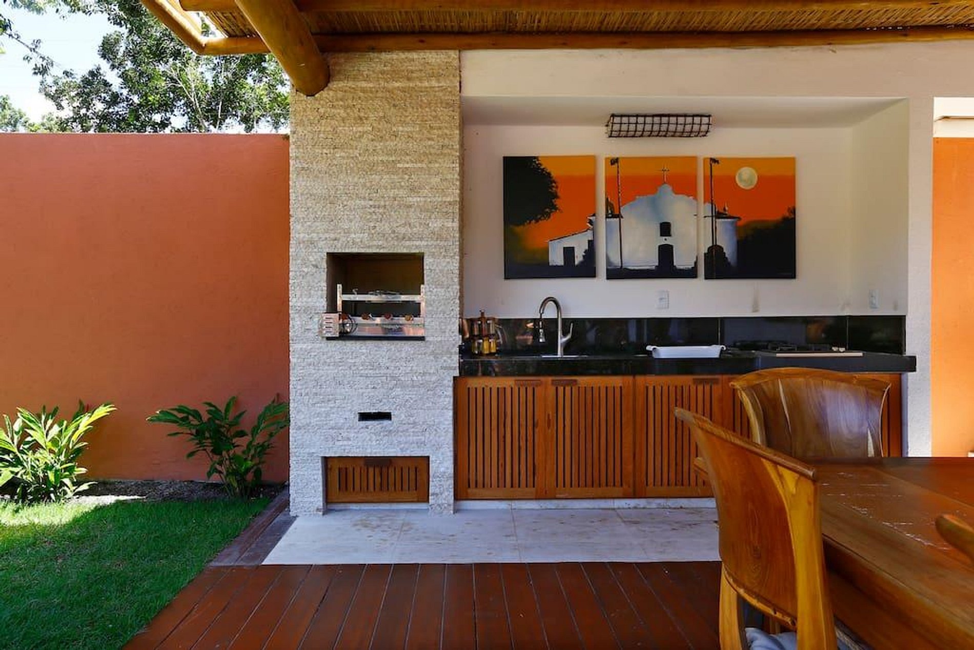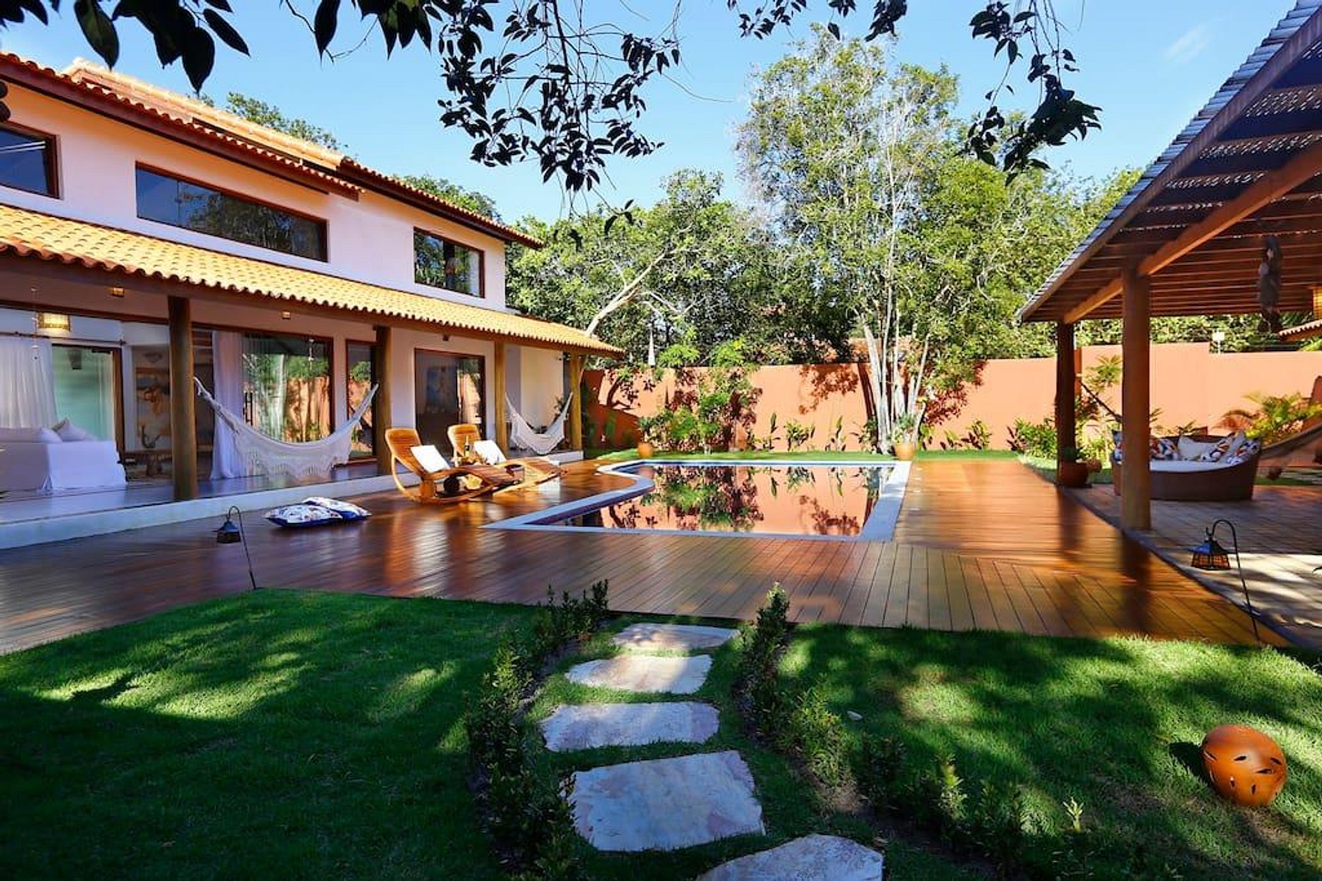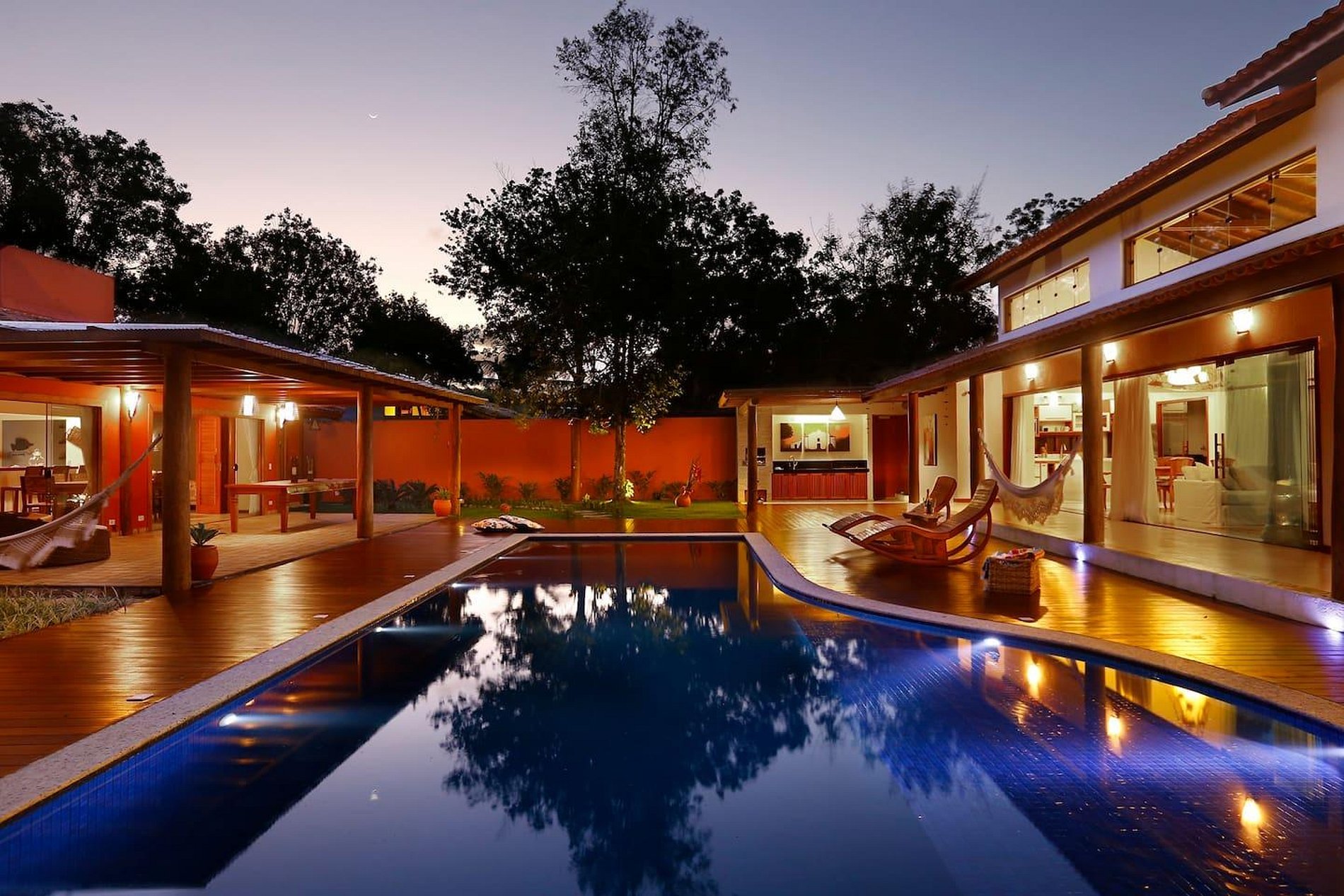 Duas casas distintas unidas por uma piscina ao meio. Essas duas casas são o fruto de uma grande história de amor dos proprietários nos últimos dez anos. A paixão que eles têm por essa casa tão especial fica clara logo que você chega lá. Cada detalhe foi escolhido para inspirar relaxamento, paz e conveniência. A maioria dos eletrodomésticos são importados e os objetos de arte foram escolhidos pessoalmente pelos donos para que sejam um reflexo de sua jornada juntos. Eles têm cinco filhos, então um dos requisitos era espaço, e parte da ideia era poder dar uma folga às crianças, deixando que elas ficassem em uma das casas e os pais na outra. A piscina fica no meio das casas, também existe uma churrasqueira e uma área para cozinhar do lado de fora.